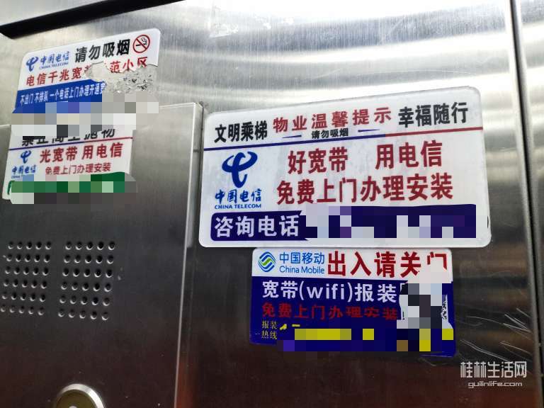 近日,在桂林临桂某小区内的电梯内,单元门,楼道,电梯出口,都能看到桂林宽带大佬们的贴贴。