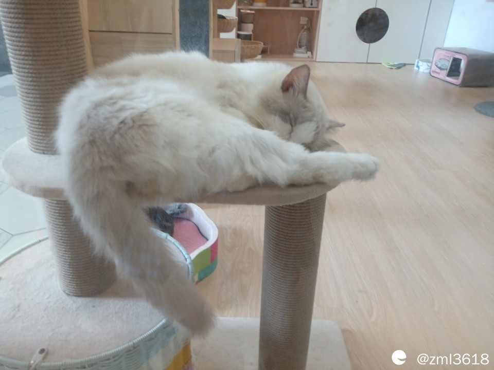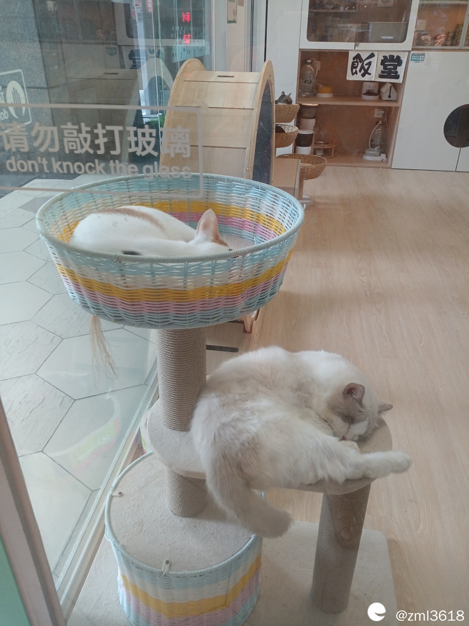 猫架子上有两只白猫在睡觉。提示:请勿敲打玻璃,怕惊吓了猫咪吧。