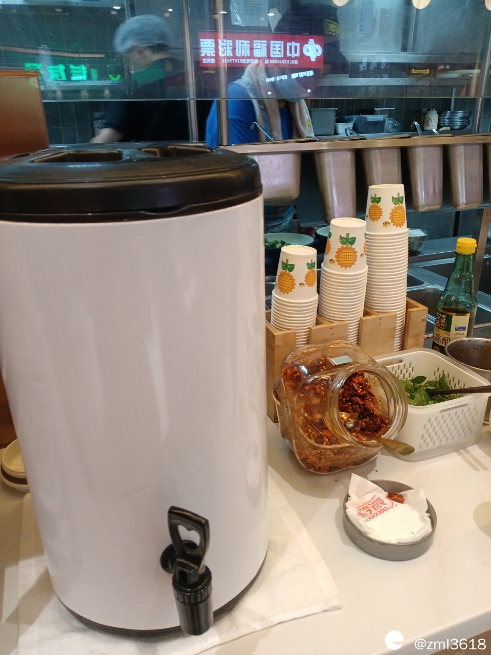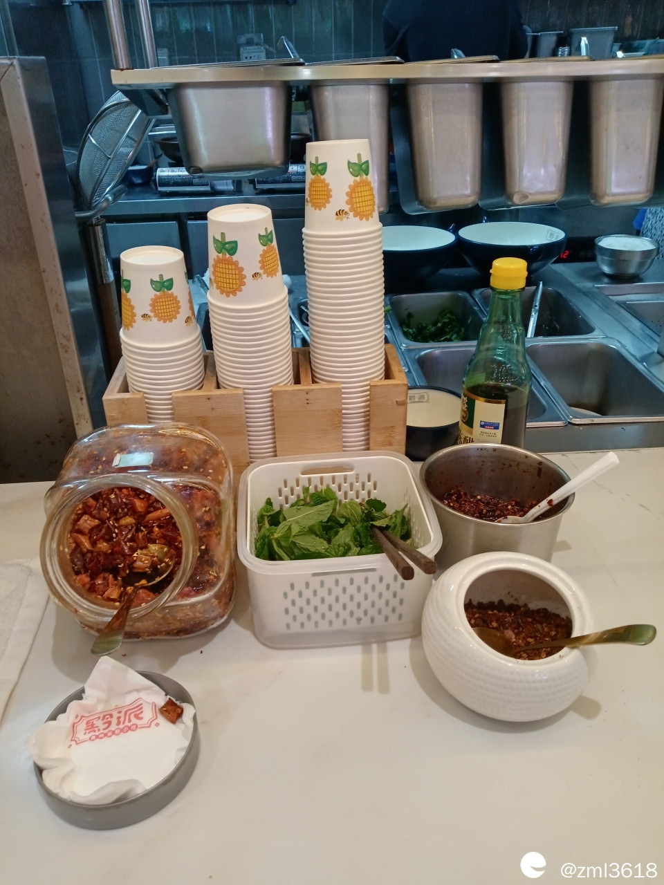 柠檬茶;自助调料台有:薄荷;大颗粒的油炸酥脆红辣椒,红油辣椒粉。
