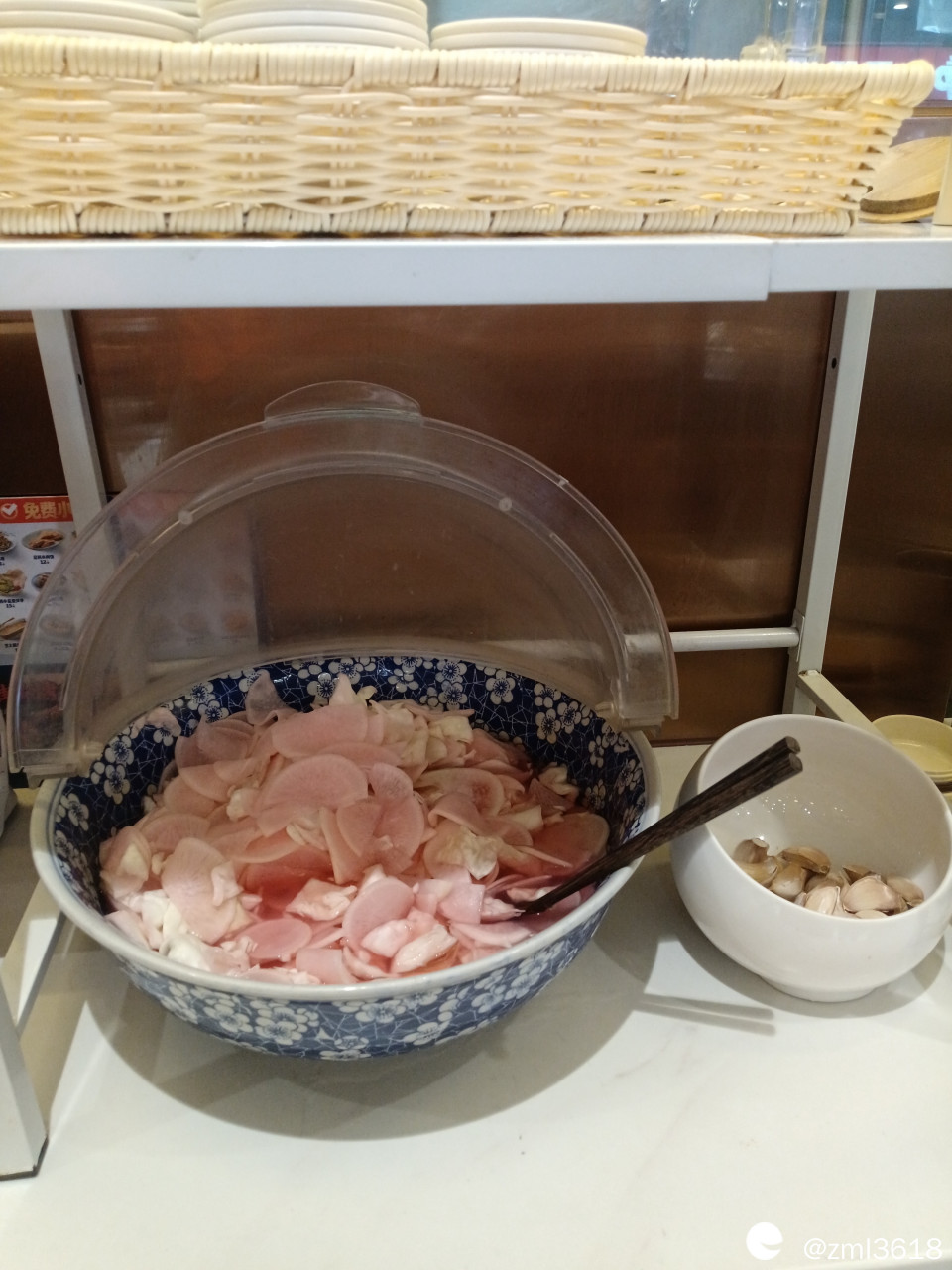 自助的酸萝卜,酸包包菜,酸甜可口,味道恰到好处。还有生大蒜粒。