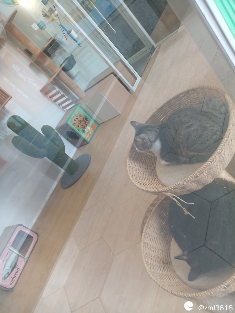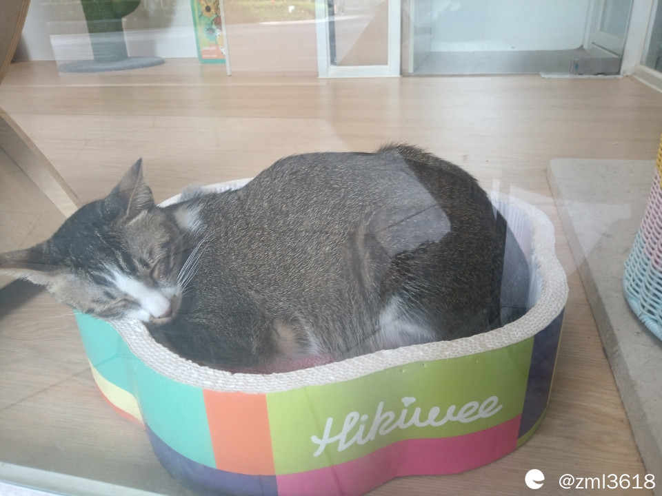 猫窝里睡着两只大猫,下面那只黑猫一直在埋头睡觉,小朋友拿我的低端华为手机,隔着玻璃给猫咪拍照,无法拍清楚猫咪的模样。