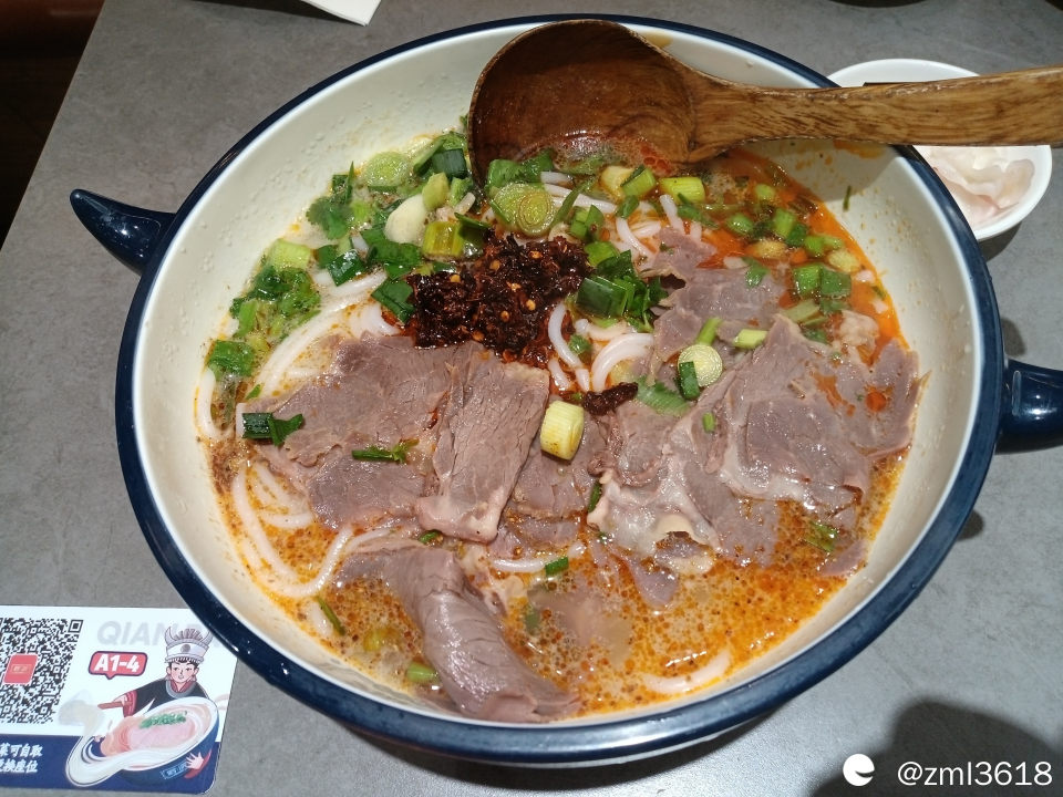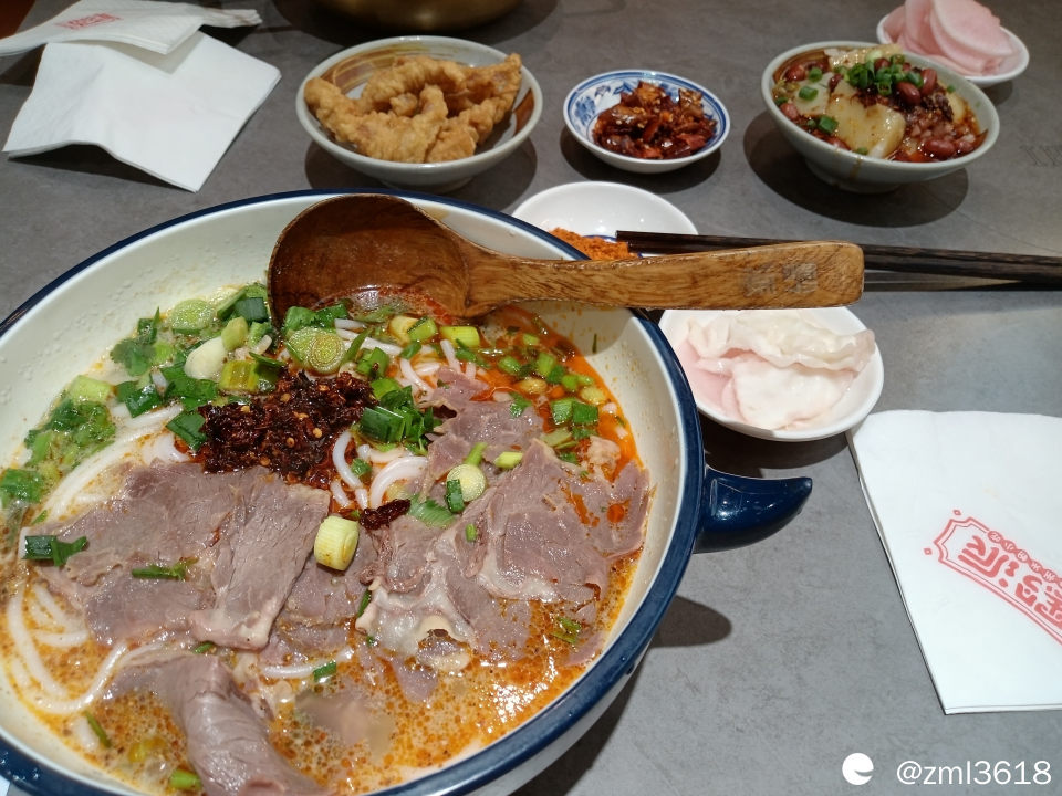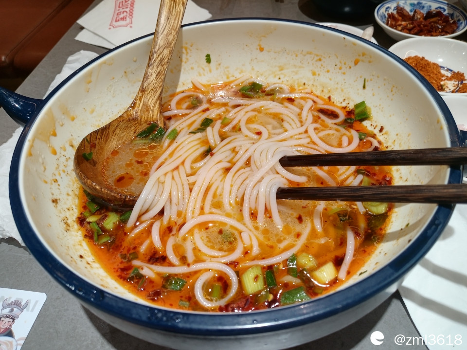 这香酥辣椒粒好吃,味道独特,酥脆而不辣。(咱曾在贵州吃过这种油炸辣椒粒)米粉很Q弹,几乎和桂林鲜湿米粉相似。尤其是羊肉汤很鲜美,薄薄的羊肉片铺满碗面,羊肉不柴不膻,口感好,撒上香葱,放点辣椒油,油红葱绿的,看上去卖相不错,吃起来,很合本人胃口。