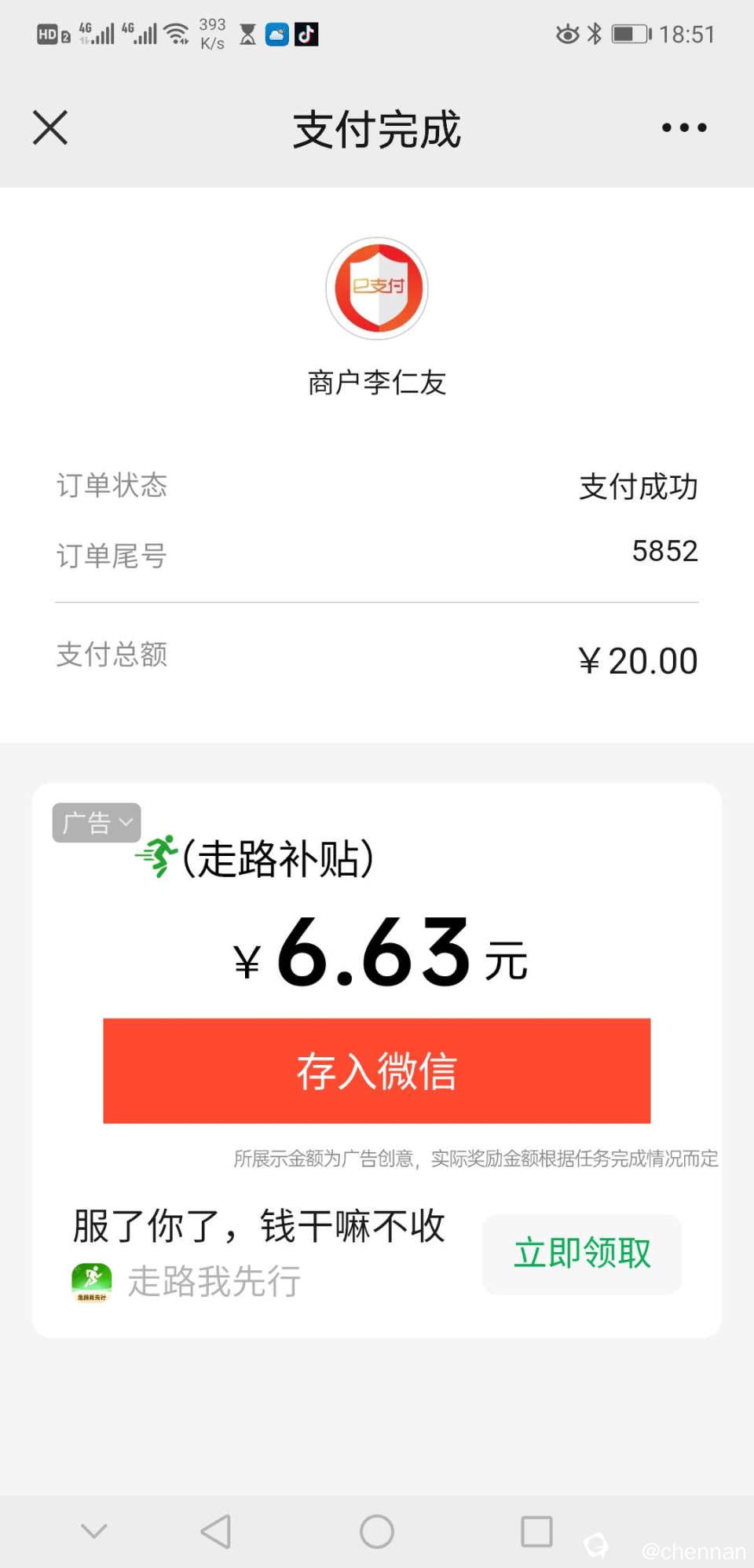 今天下午去菜市一摊位买东西,微信支付完以后跳出来这个东西,莫名其妙会送钱给你?管他真的假的,坚信不贪便宜就不会上当这个真理,跳过。