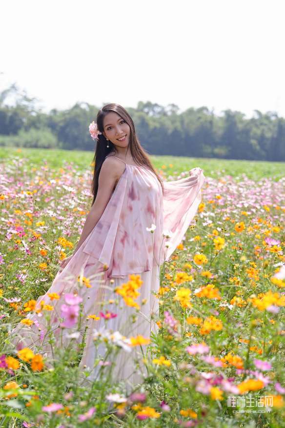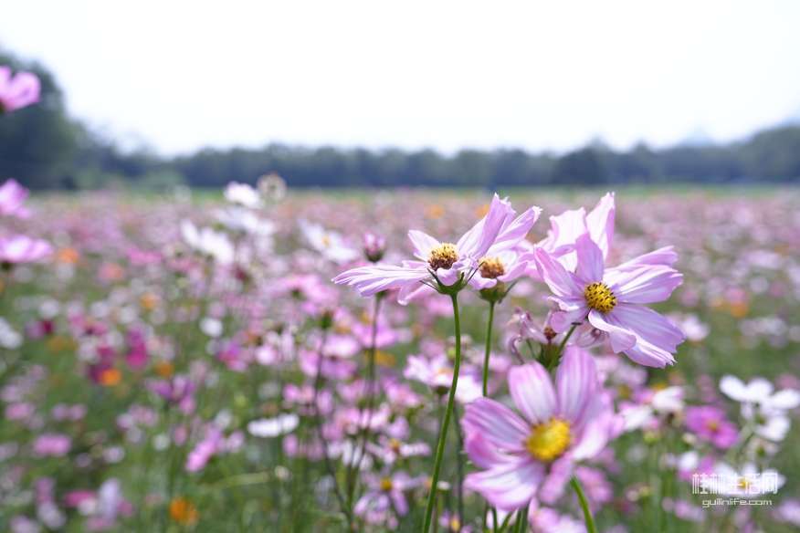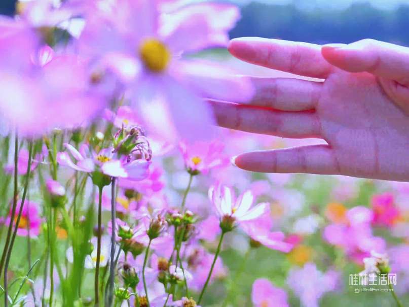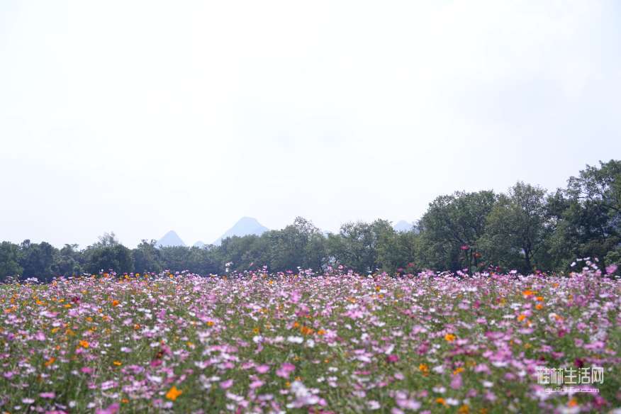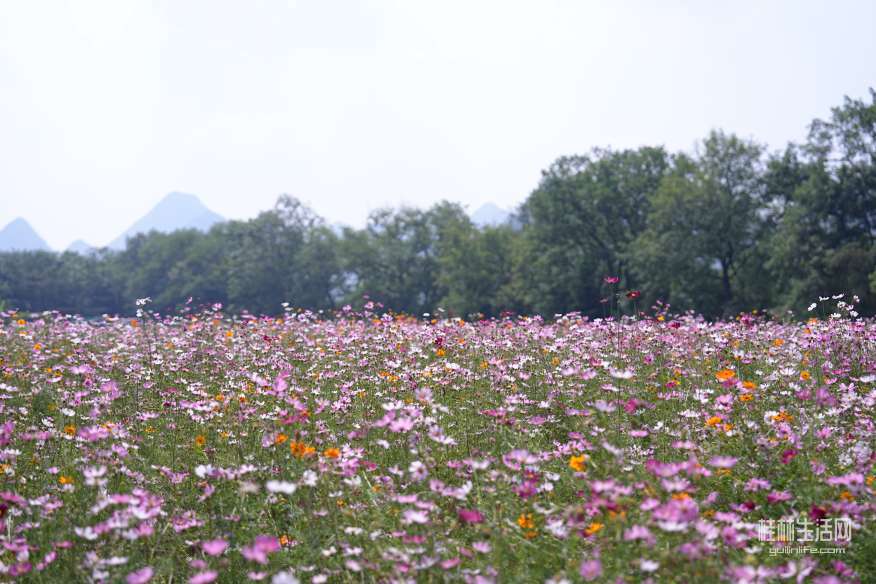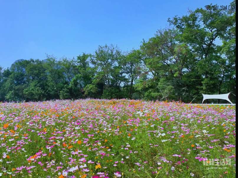 当漓江的晨雾还未散尽,花田里的硫华菊泼洒出明黄的花浪,格桑花在风里摇晃着粉白的裙——每一朵都像是从漓江画里跳出来的色彩。