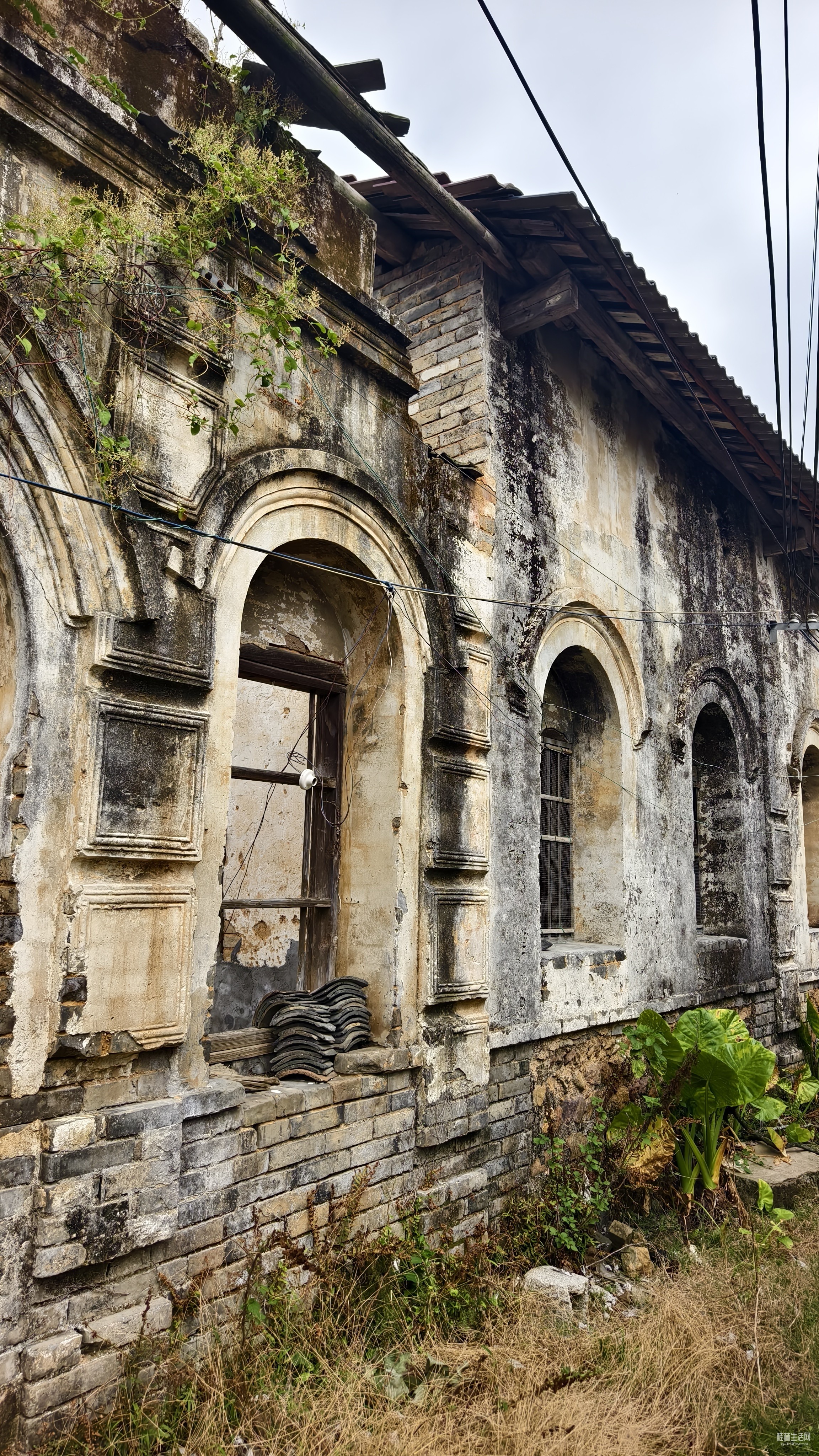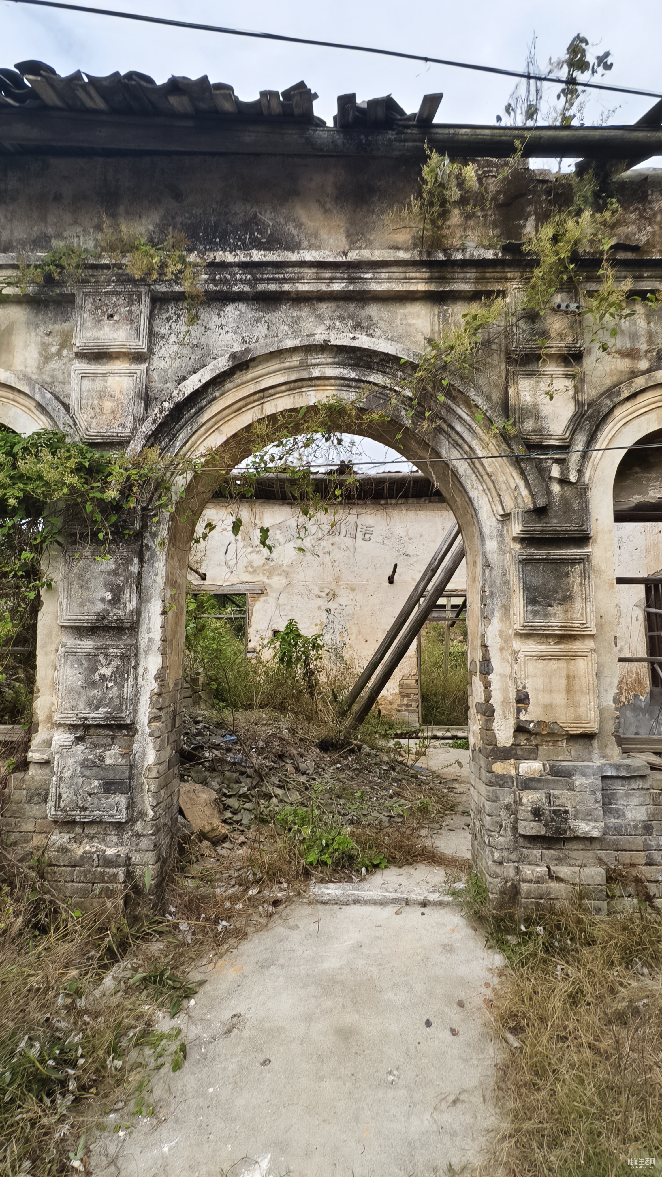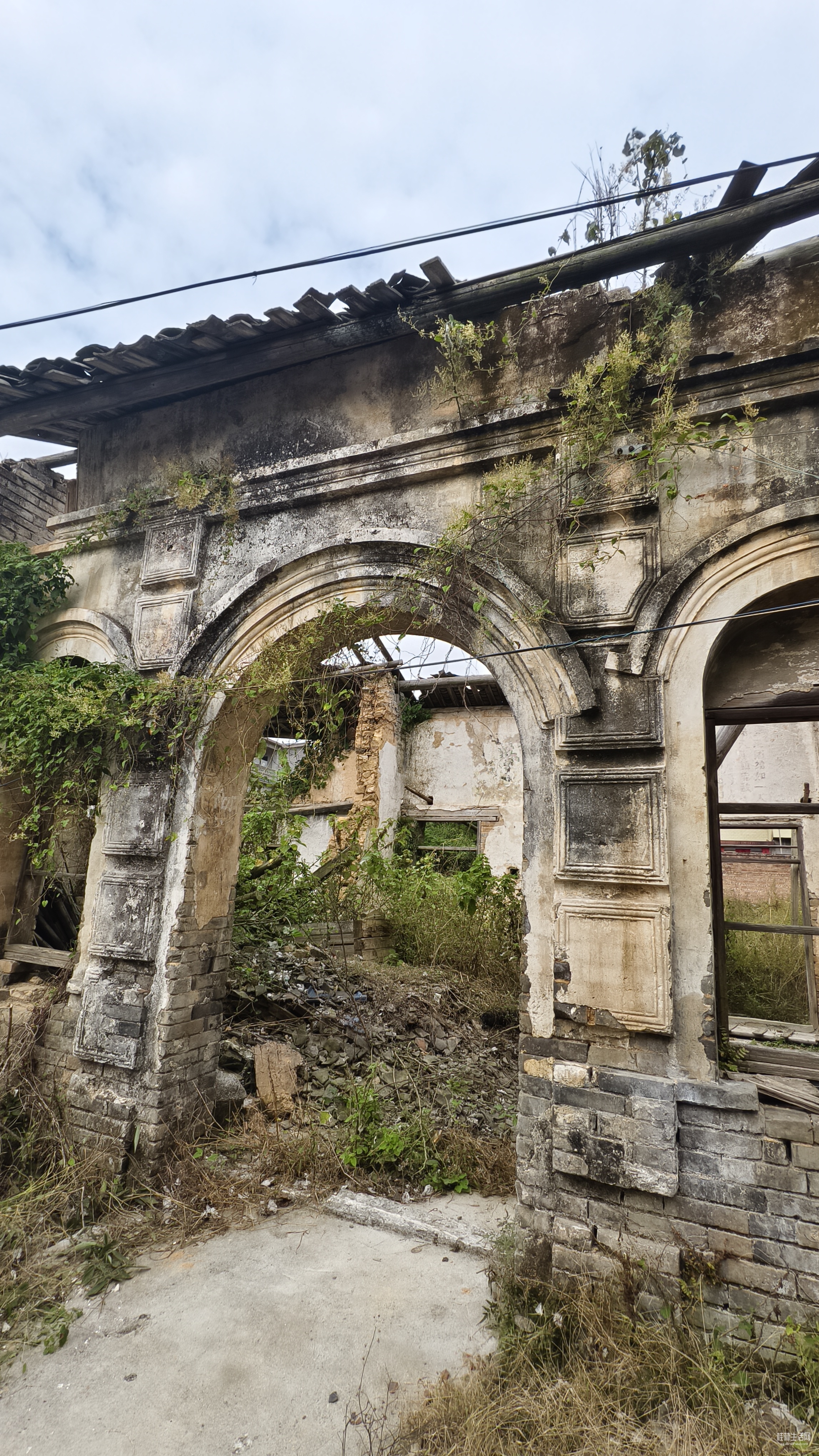 这是广西灵川县灵田镇金竹村的民国建筑,属于灵田古民居群的一部分。建筑融合了民国时期的工艺特色,墙体在沧桑的岁月里已经斑驳,欧式拱券与中式砖瓦的结合仍别具韵味,藤蔓与荒草在建筑缝隙间疯长,仿佛在无声地诉说着岁月的故事。