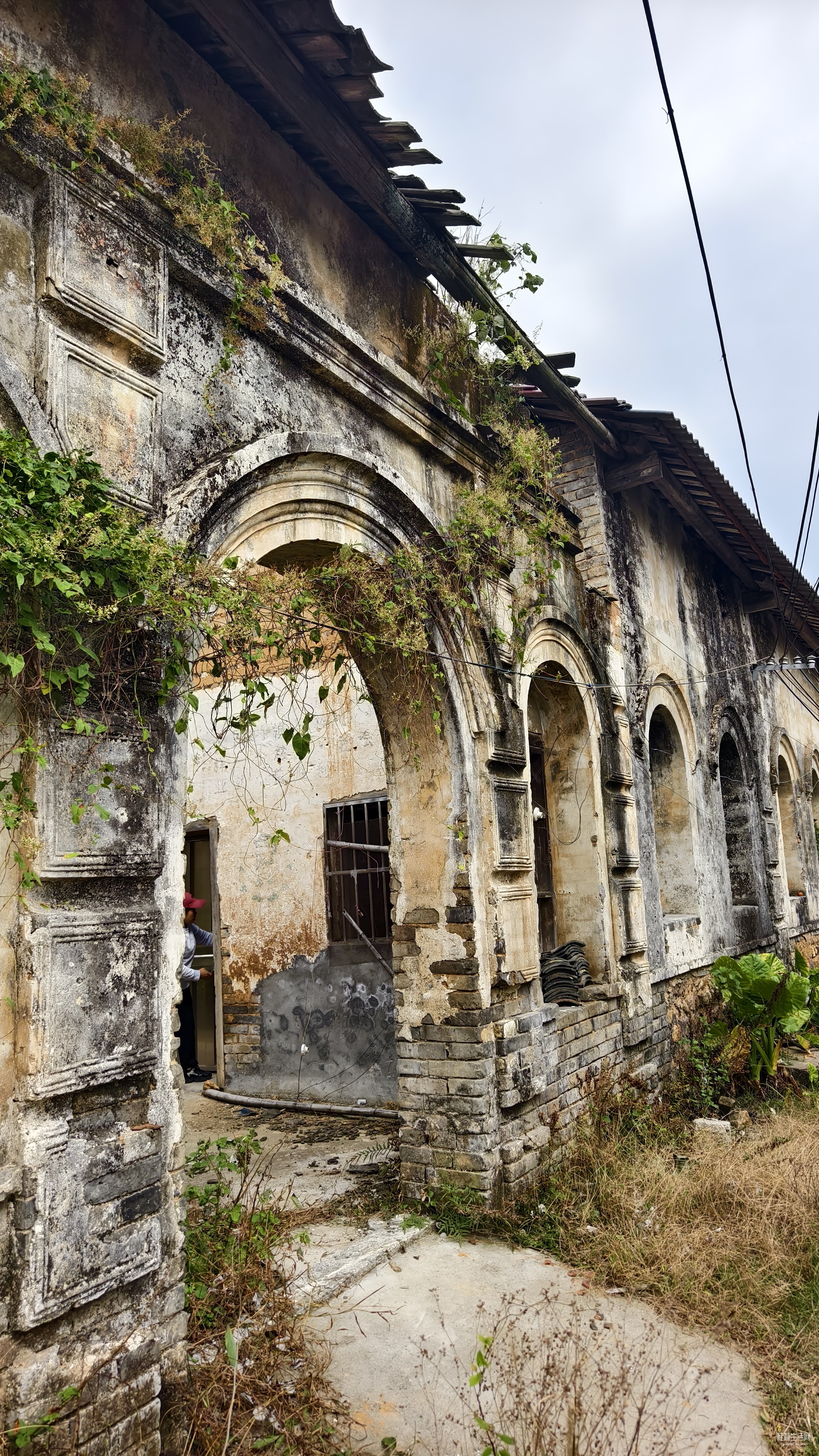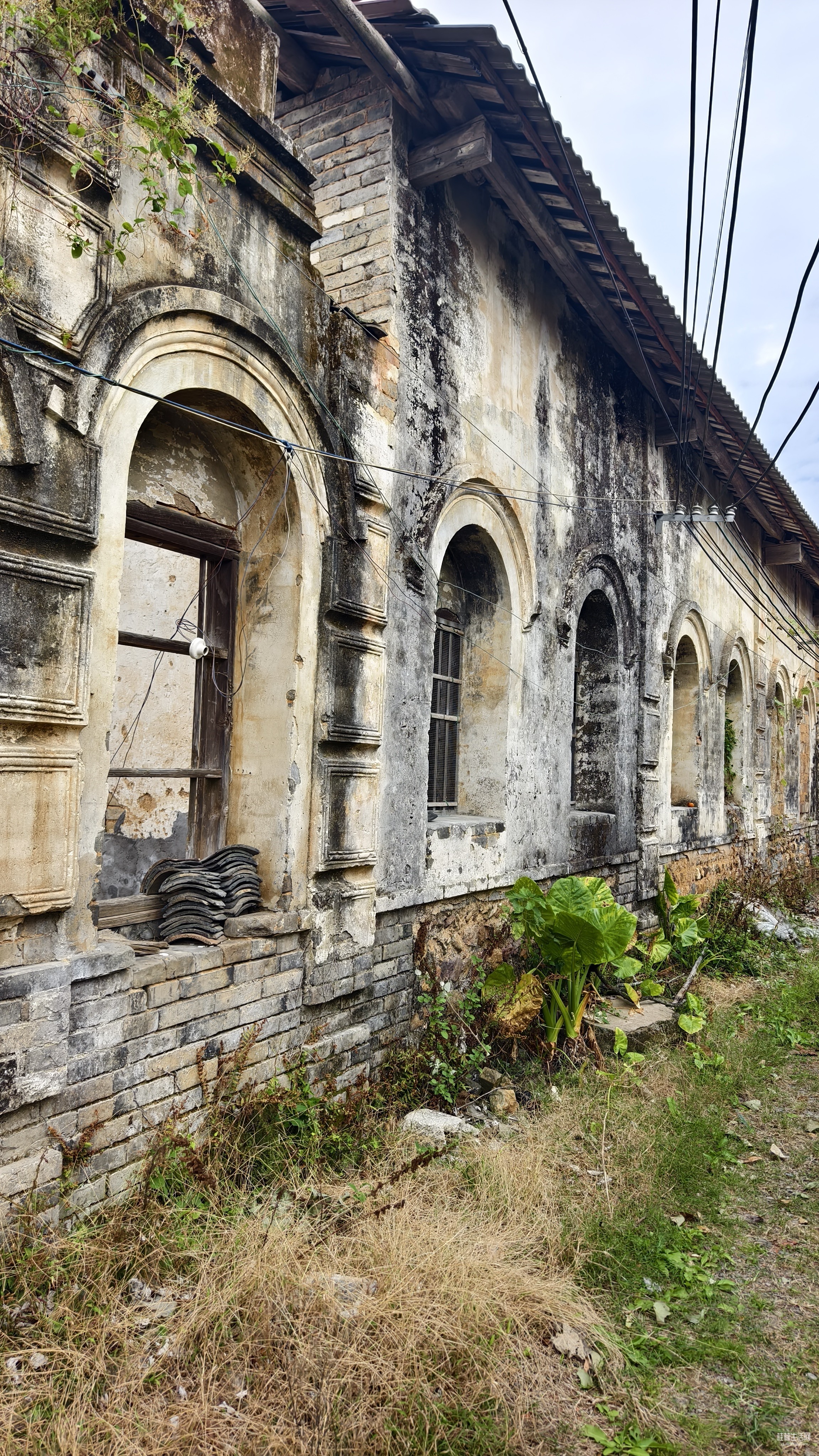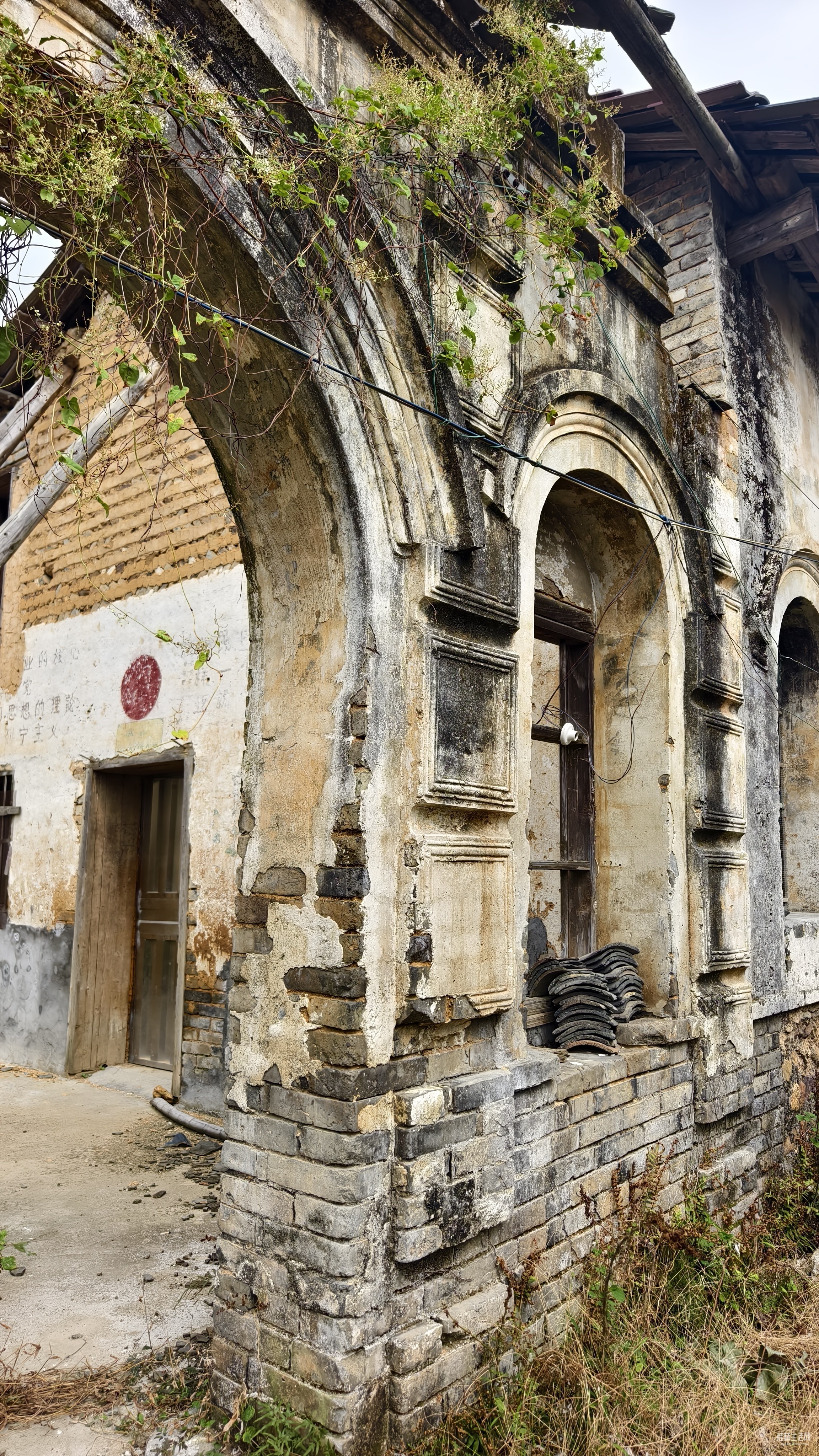 这是广西灵川县灵田镇金竹村的民国建筑,属于灵田古民居群的一部分。建筑融合了民国时期的工艺特色,墙体在沧桑的岁月里已经斑驳,欧式拱券与中式砖瓦的结合仍别具韵味,藤蔓与荒草在建筑缝隙间疯长,仿佛在无声地诉说着岁月的故事。