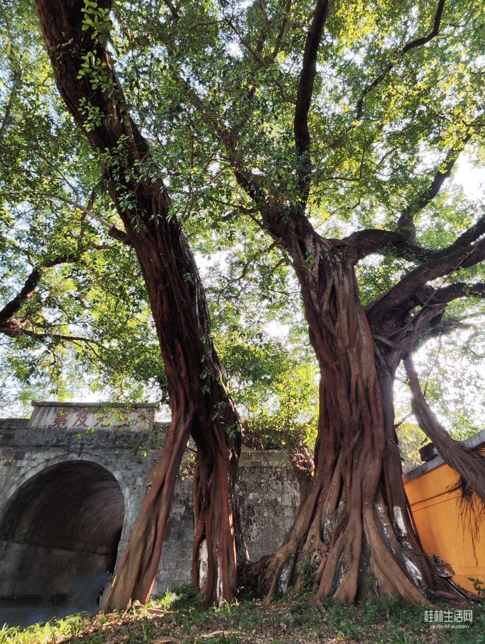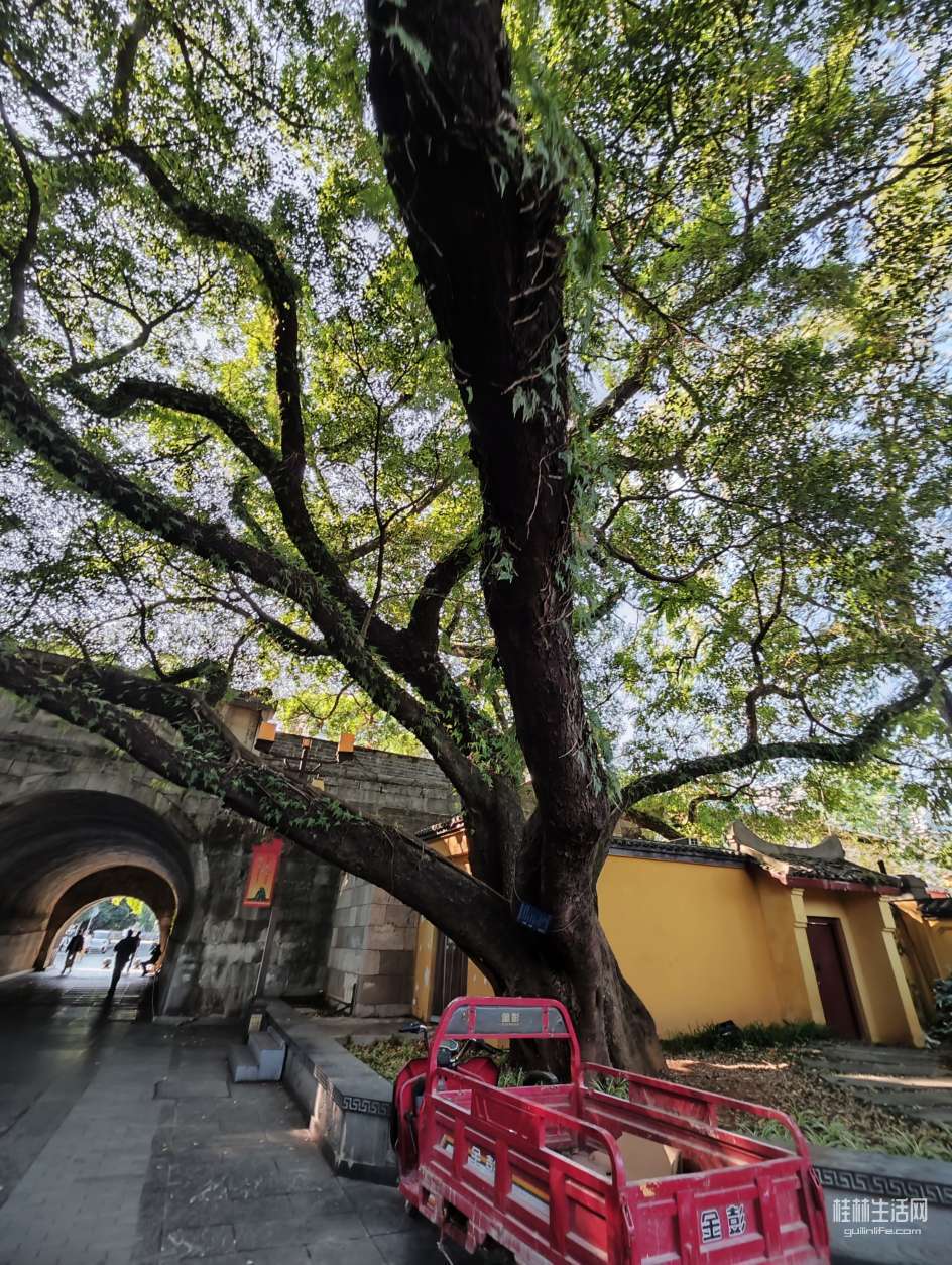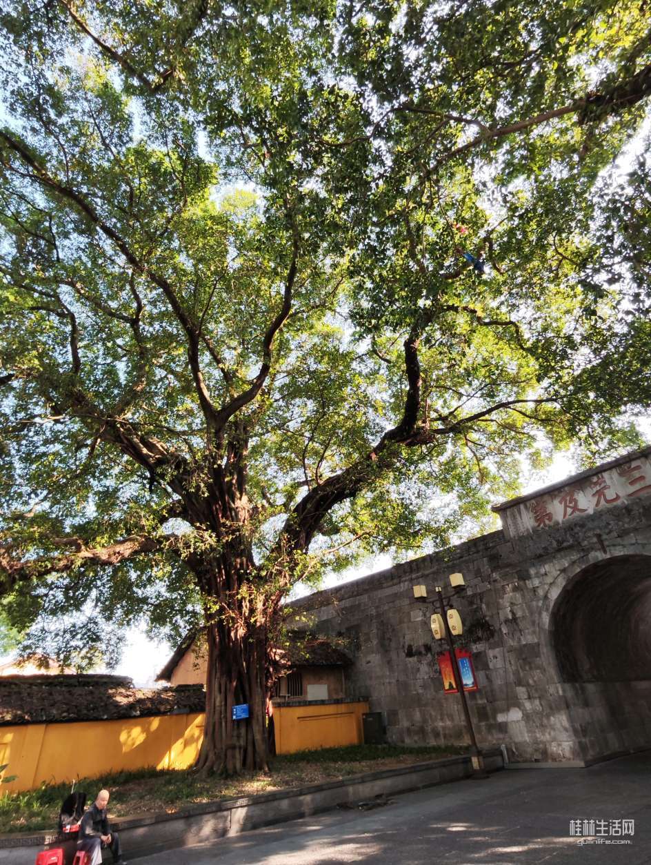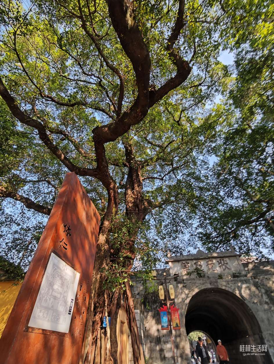 靖江王城三个大门:三元及第、状元及第、榜眼及第都有大榕树,长得腰围粗壮冠盖如云的共七棵,原以为它们至少都有三、五百年树龄,实地一看其实各自才一百岁,清末民初生,相比古南门大榕树属于树子树孙,跟阳朔一千五百岁大榕树更不能相提并论。