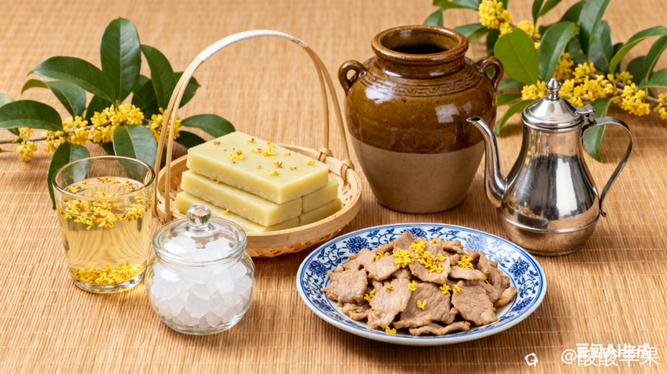 · 桂花酿:这个就有点讲究了,家里有会搞的老人家,用糯米和桂花一起发酵,搞出来的米酒又香又甜,冬天温一小杯,脚底板都是暖的。(没会搞的莫乱学,容易搞成醋!)