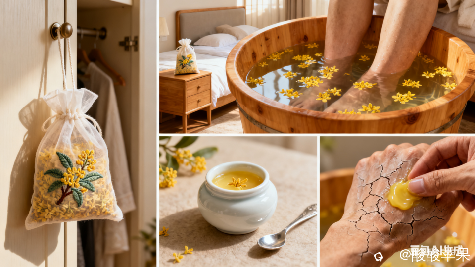 · 润肤桂花蜜:搞点上好的土蜂蜜,泡进干桂花,放个把星期。冬天手脚开裂,挖一坨抹上去,又润又香,比护肤品还灵。