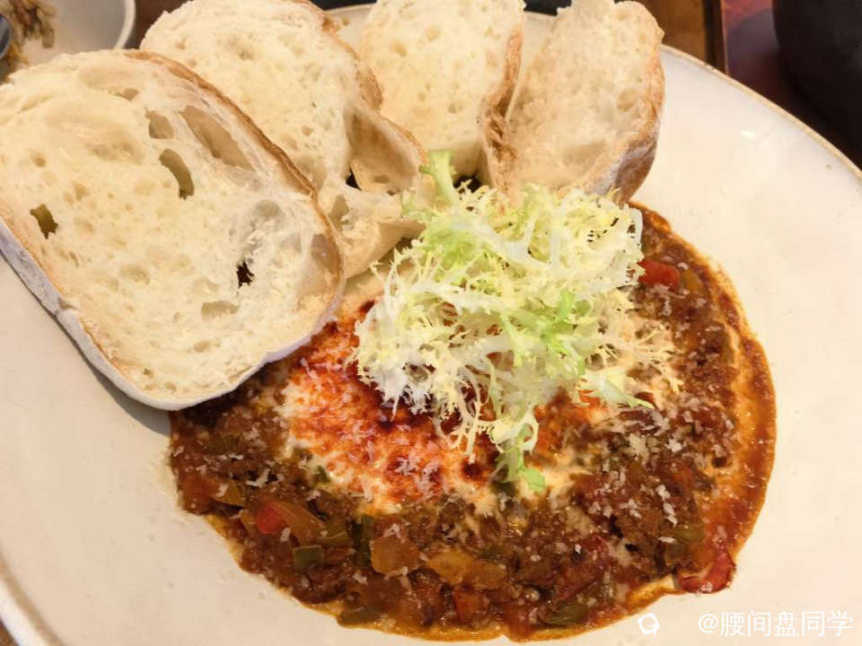 新北非蛋佐恰巴塔,不要说从来没吃过,这个名字也是从来没看过,我就说像面包,但是面包蘸着秘制的肉沫酱料,哇塞,亚比!