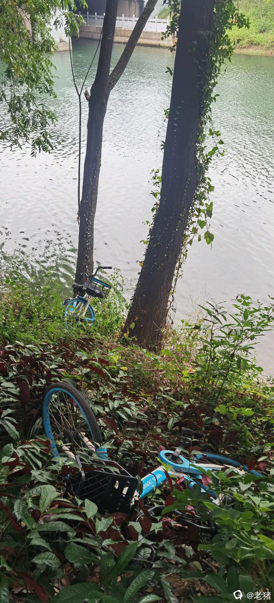 小东江江东桥东北角,几辆小蓝车被扔下了河堤,还有一辆完全泡在水里……唉,无语了