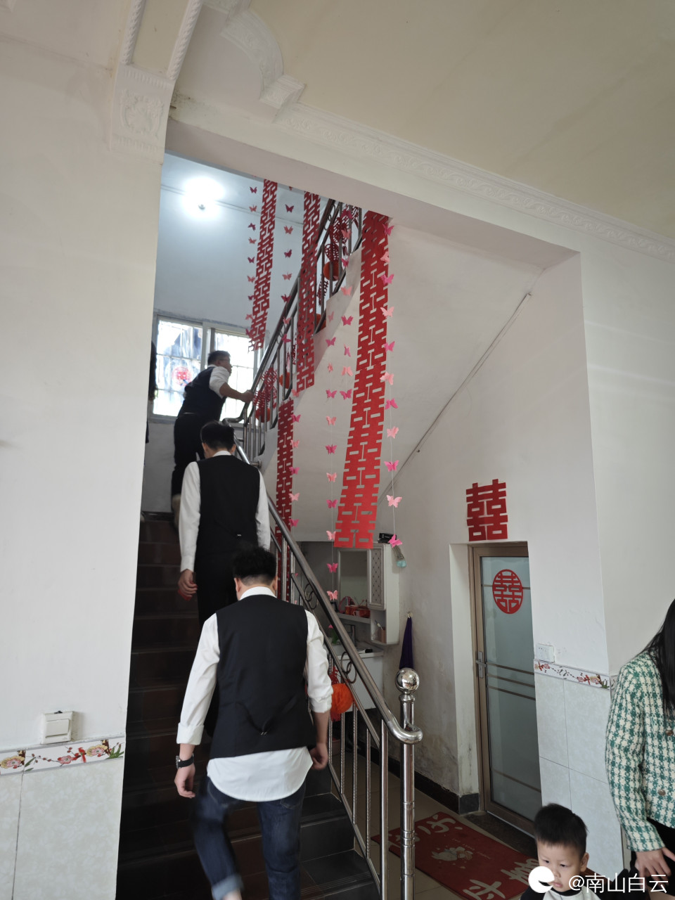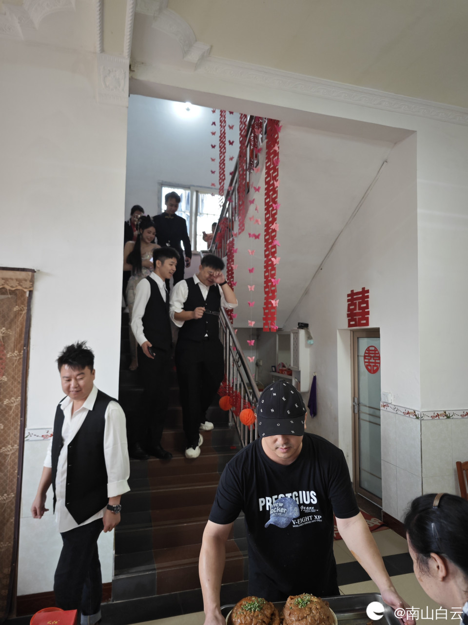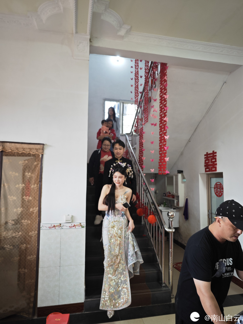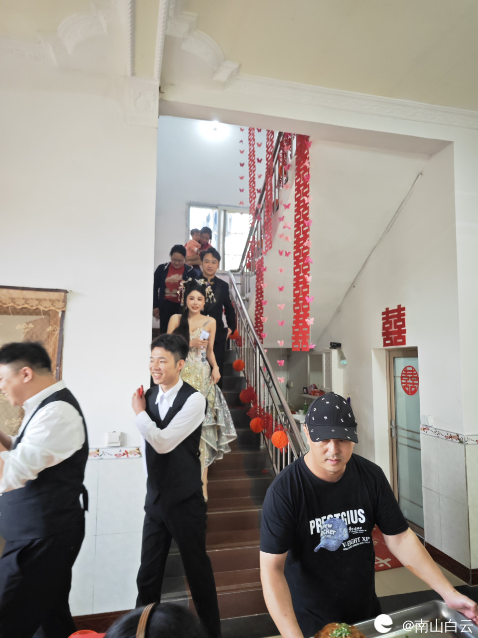 新娘和新郎在伴娘伴郎簇拥下从闺房下来,她们脸上写下来幸福快乐的符号。祝福他们白头偕老,早生贵子。