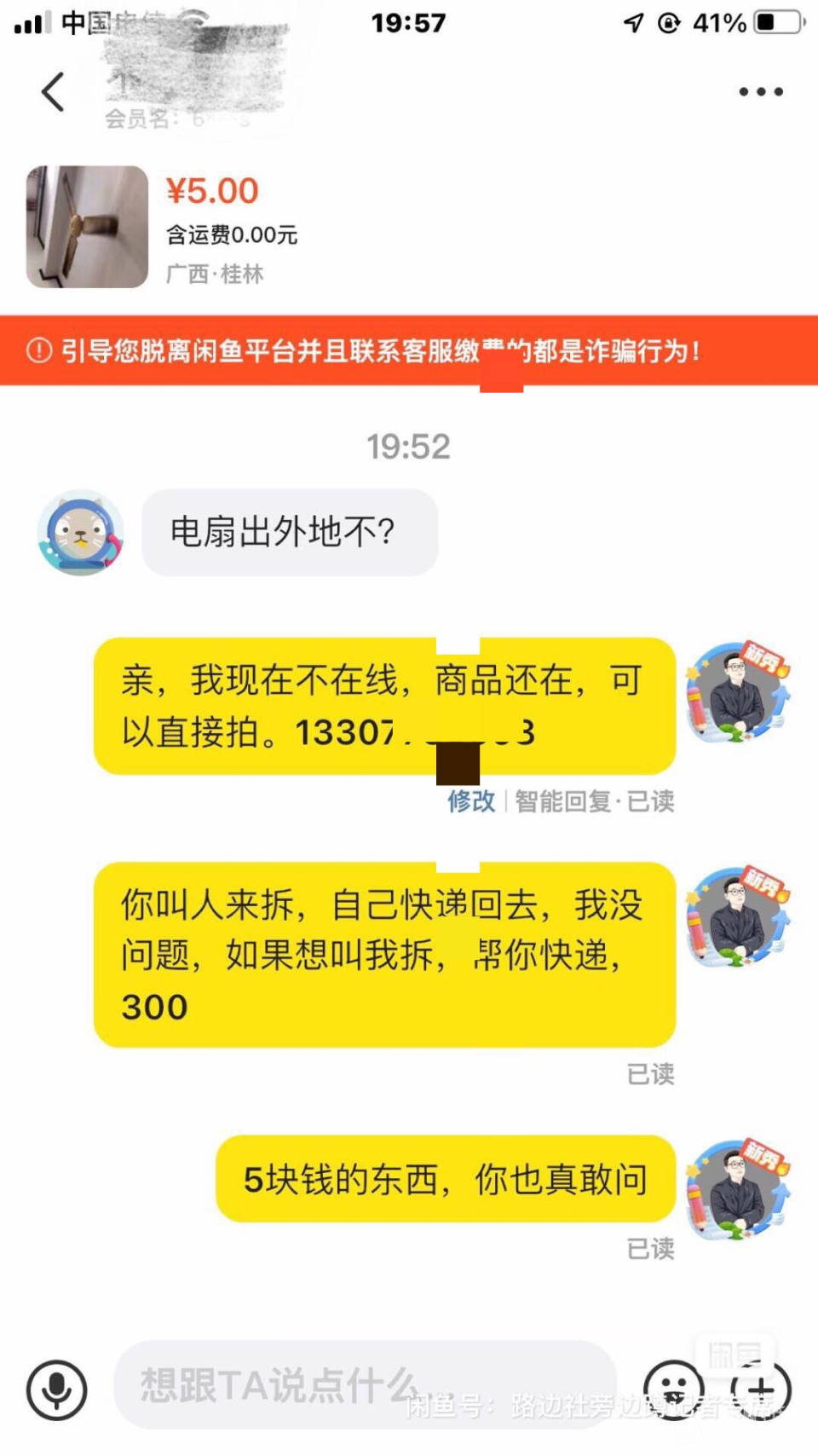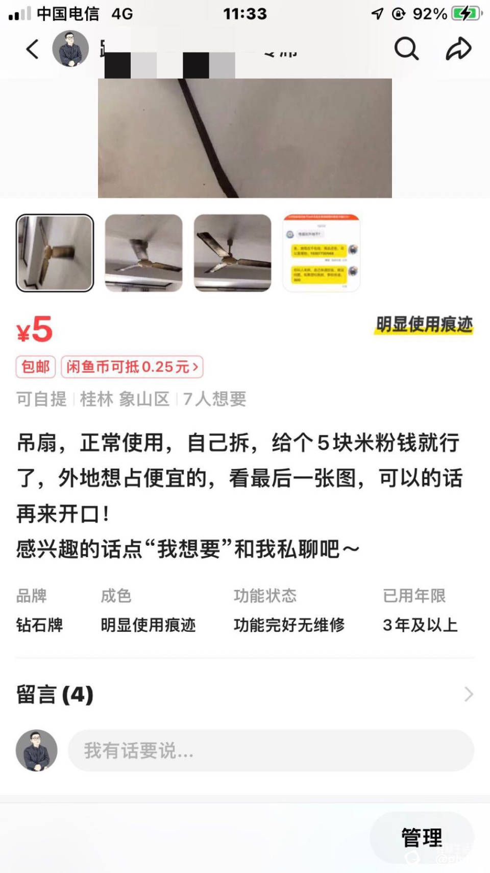 前段时间家里一套旧房子重新装修,就把原来的旧家具家电能正常使用的全挂海鲜市场换点碎银子,一个5块的吊扇,外地一个奇葩问出不出外地,我也是无语完了