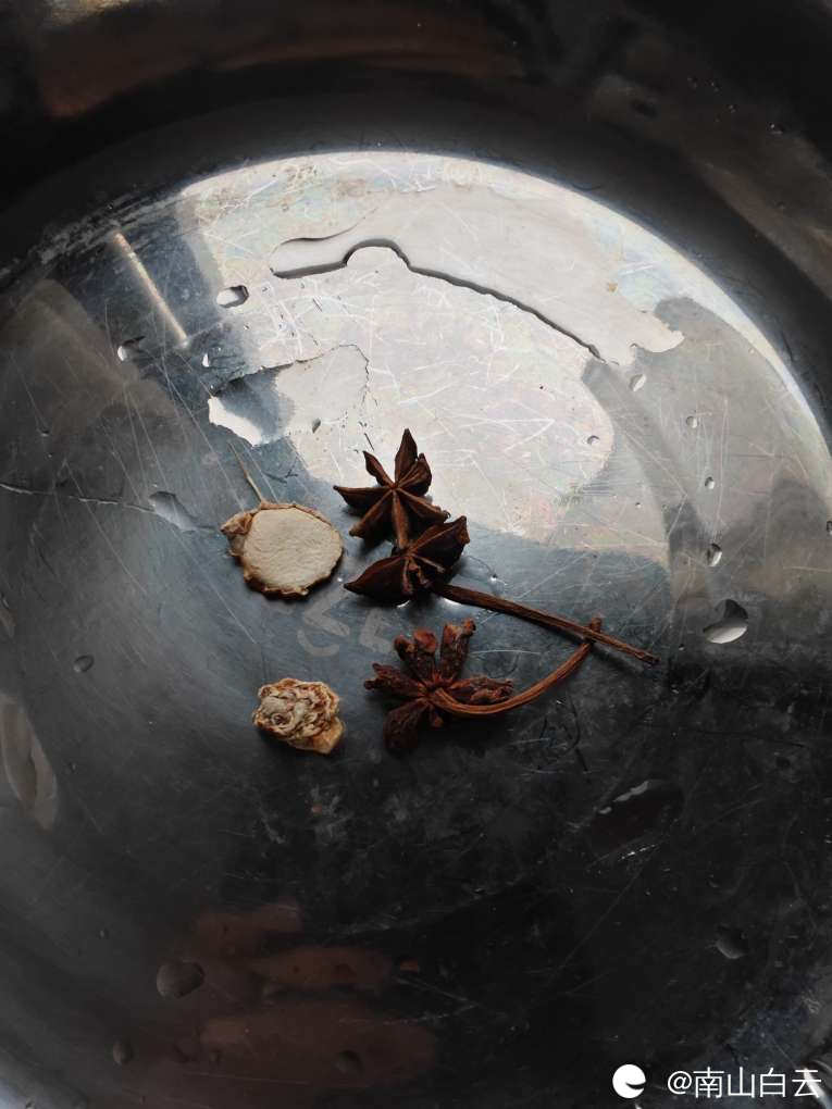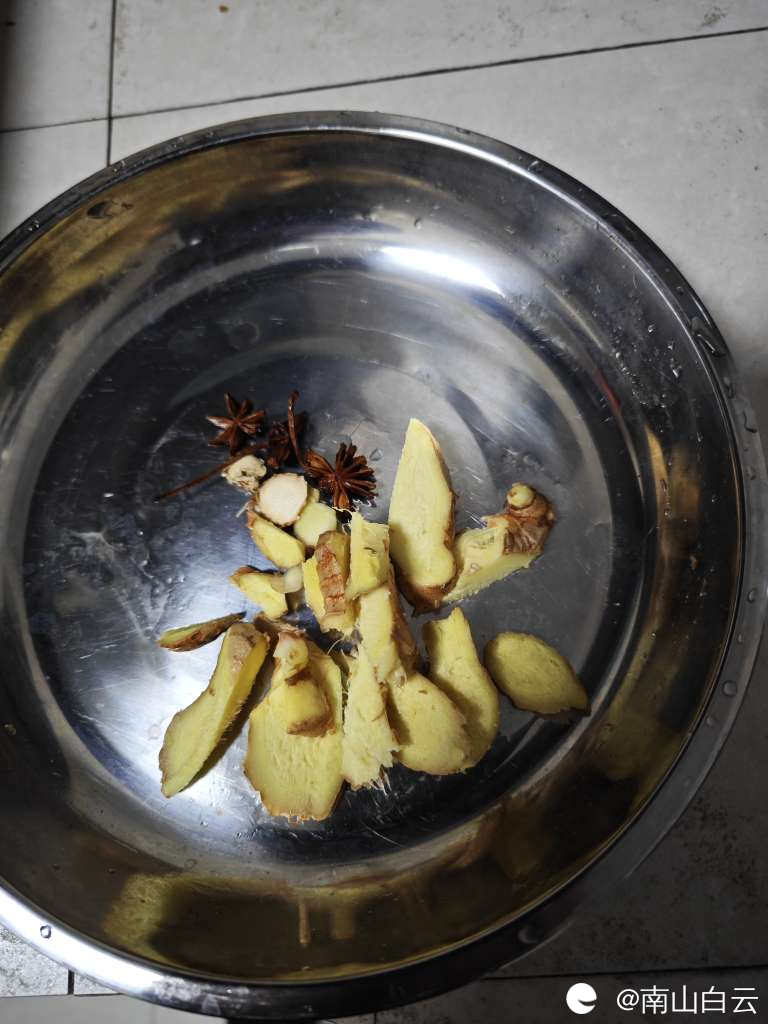 用开水反复洗净后,再放入炒锅,加八角沙姜,盐酱油和红酒。