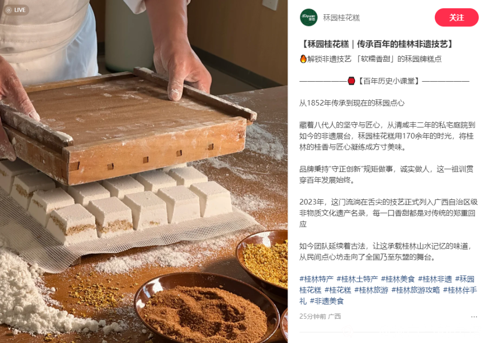 最近几年很多人都拿非遗当噱头来炒作,始作俑者就是营销大师小罐茶。现在这样的非遗概念在桂林也出现了,今天就在网上看见街上卖的桂花糕也被称作非遗技艺。