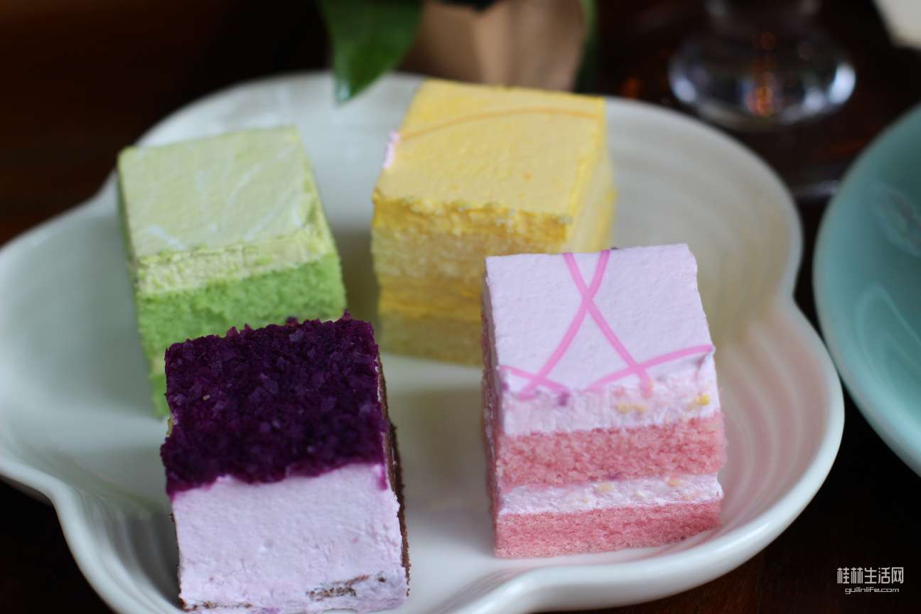 慕斯小蛋糕,四种不同的颜色四种不同的口味,我和莹莹每块都分了一半:抹茶、草莓、芒果……每样我都爱吃。喵喵喵~