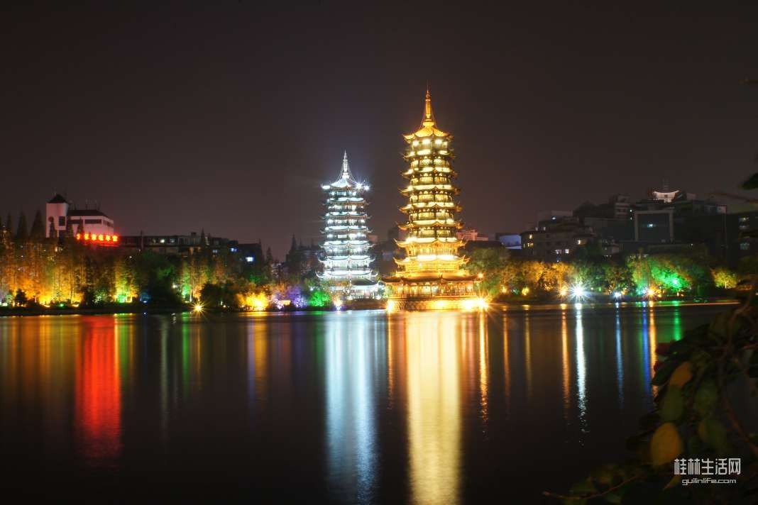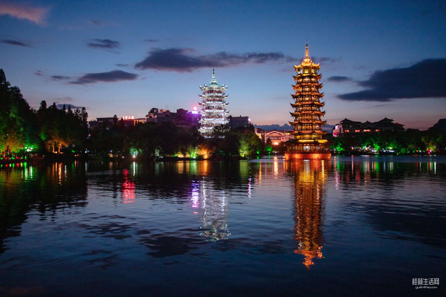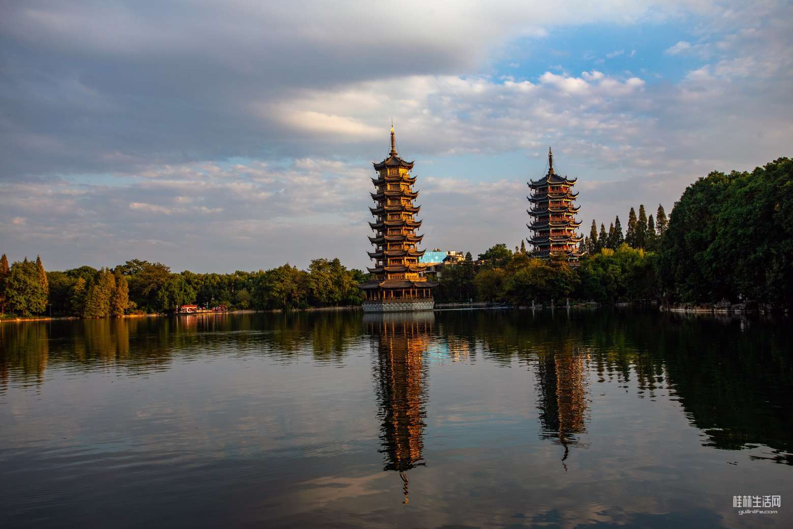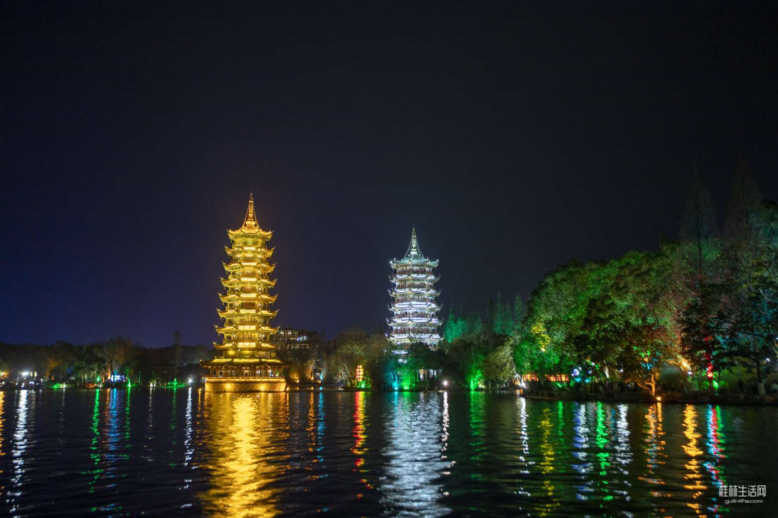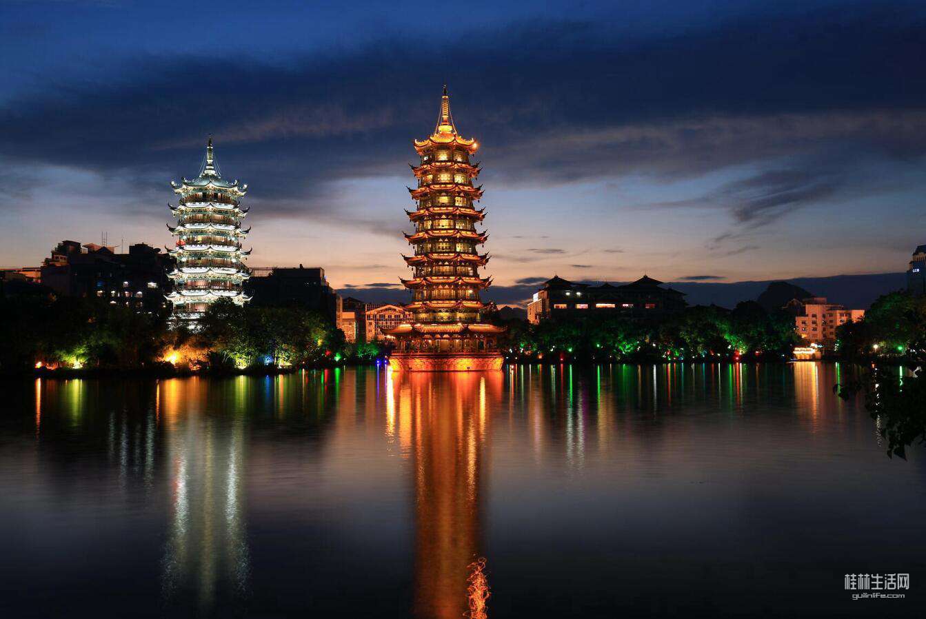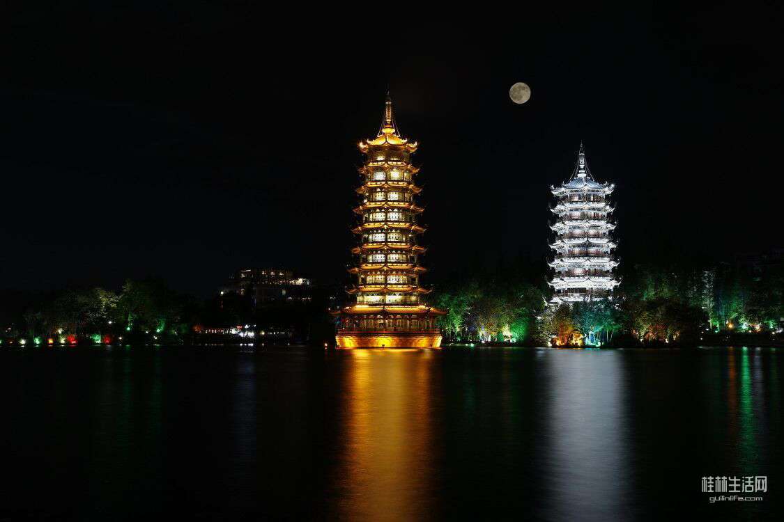 桂林日月双塔,其中日塔高41米共九层,通体均为纯铜装饰,耗用铜材350吨,金碧辉煌,并有电梯供游客观光乘坐。铜塔所有构件如塔什、瓦面、翘角、斗拱、雀替、门窗、柱梁、天面、地面完全由铜壁画装饰,整座铜塔创下了三项世界之最——世界上最高的铜塔,世界上最高的铜质建筑物,世界上最高的水中塔。 月塔高35米共七层,为琉璃塔。每层的雕花彩绘门窗寓意不同的主题,富含中国传统韵味,通过水下湖底一条10米长的湖底隧道与日塔连接,其地宫之中有桂林明代青花梅瓶大型壁画。杉湖日月双塔已成为观赏桂林城市精华美景的胜地。