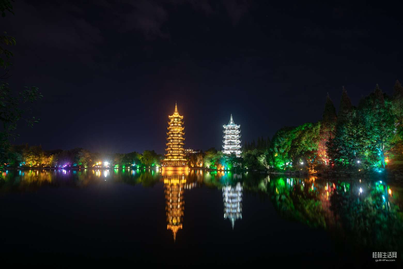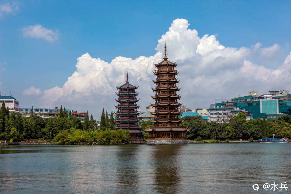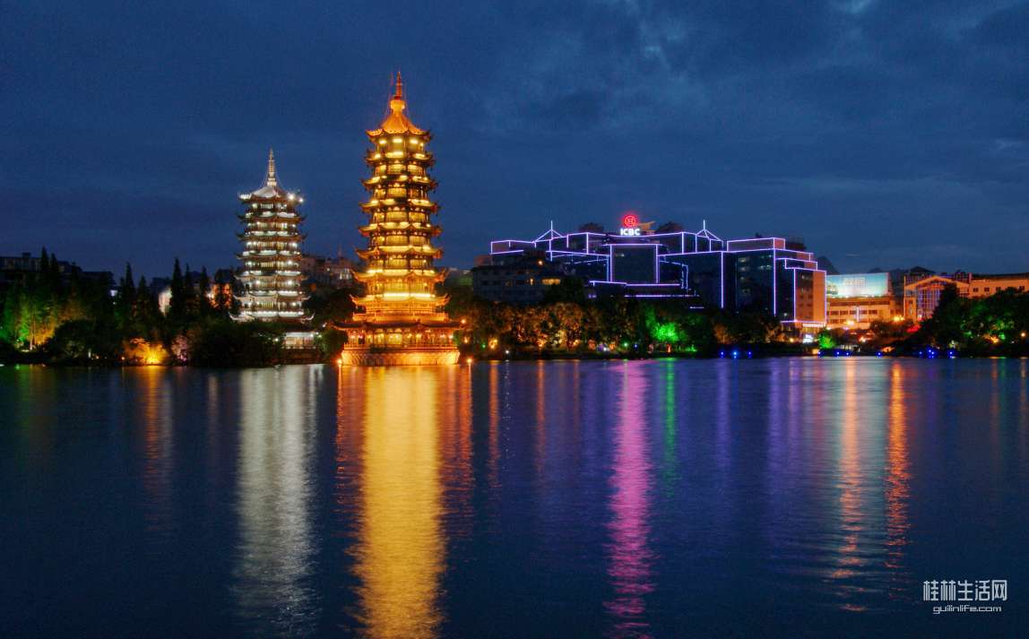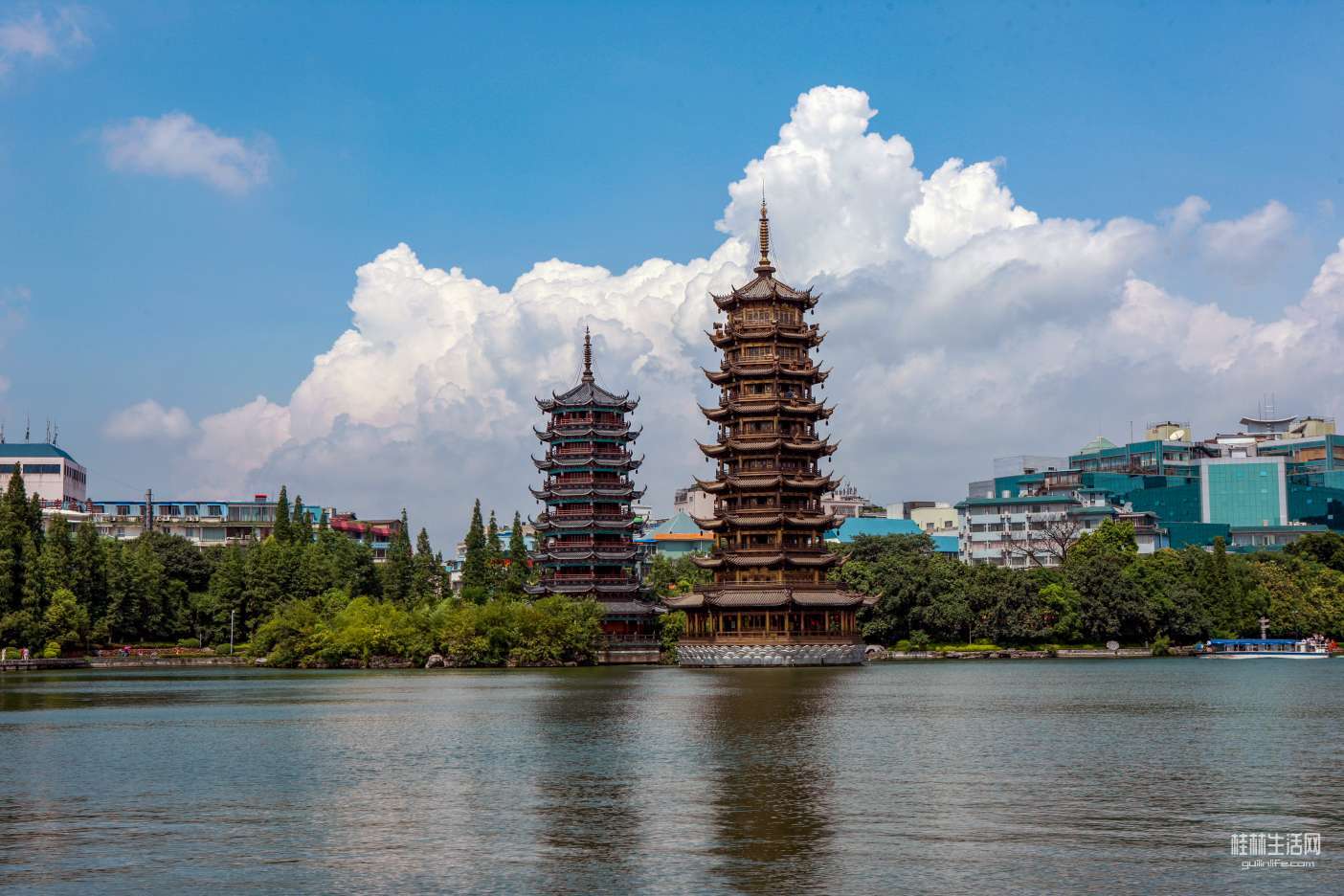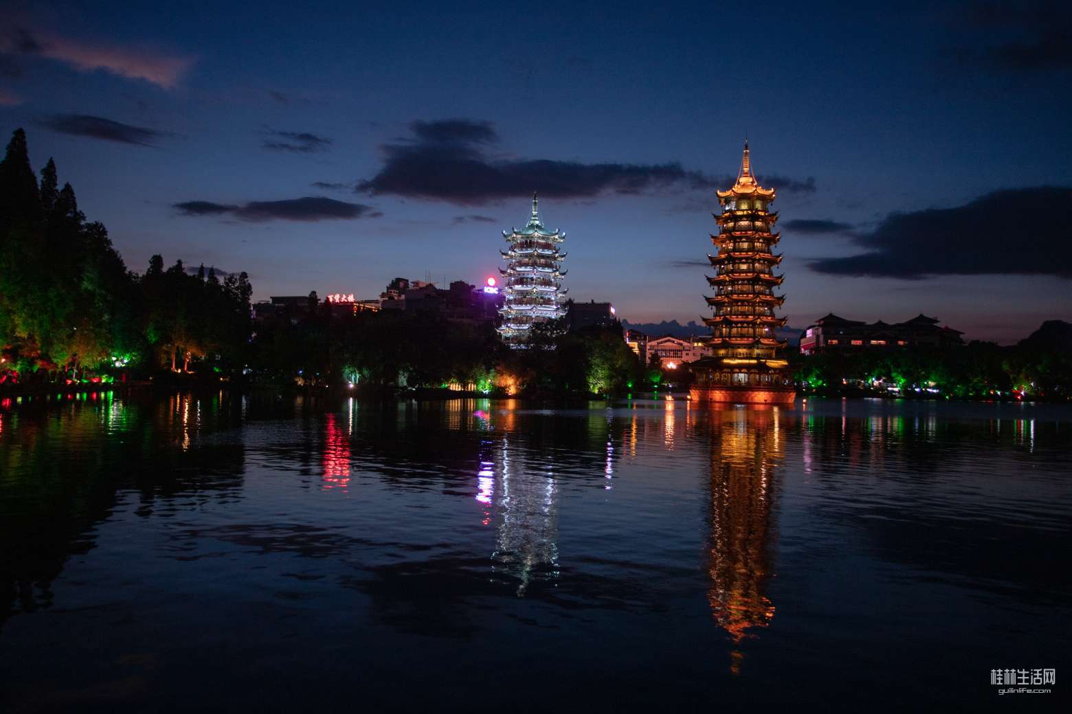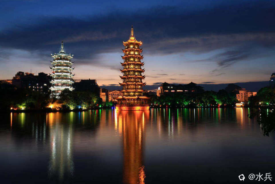 桂林日月双塔,其中日塔高41米共九层,通体均为纯铜装饰,耗用铜材350吨,金碧辉煌,并有电梯供游客观光乘坐。铜塔所有构件如塔什、瓦面、翘角、斗拱、雀替、门窗、柱梁、天面、地面完全由铜壁画装饰,整座铜塔创下了三项世界之最——世界上最高的铜塔,世界上最高的铜质建筑物,世界上最高的水中塔。 月塔高35米共七层,为琉璃塔。每层的雕花彩绘门窗寓意不同的主题,富含中国传统韵味,通过水下湖底一条10米长的湖底隧道与日塔连接,其地宫之中有桂林明代青花梅瓶大型壁画。杉湖日月双塔已成为观赏桂林城市精华美景的胜地。