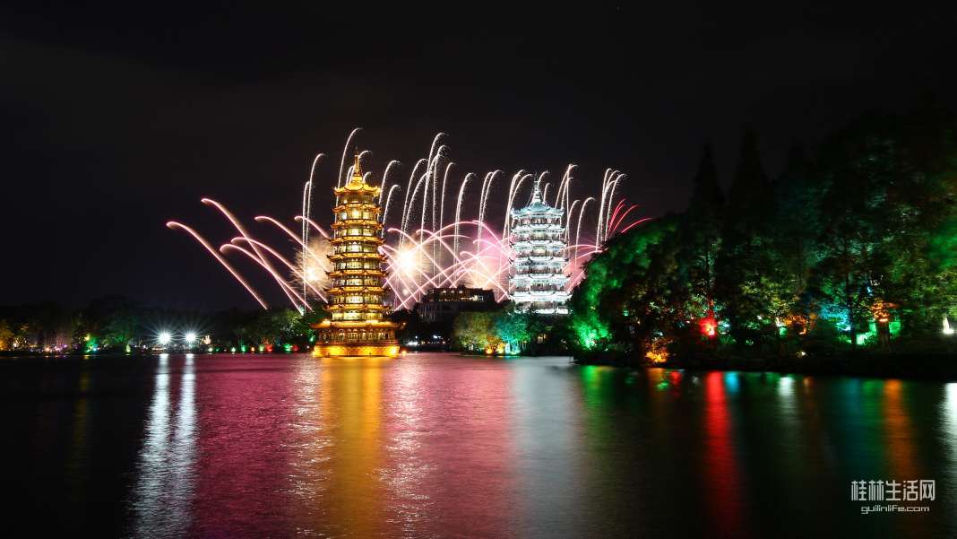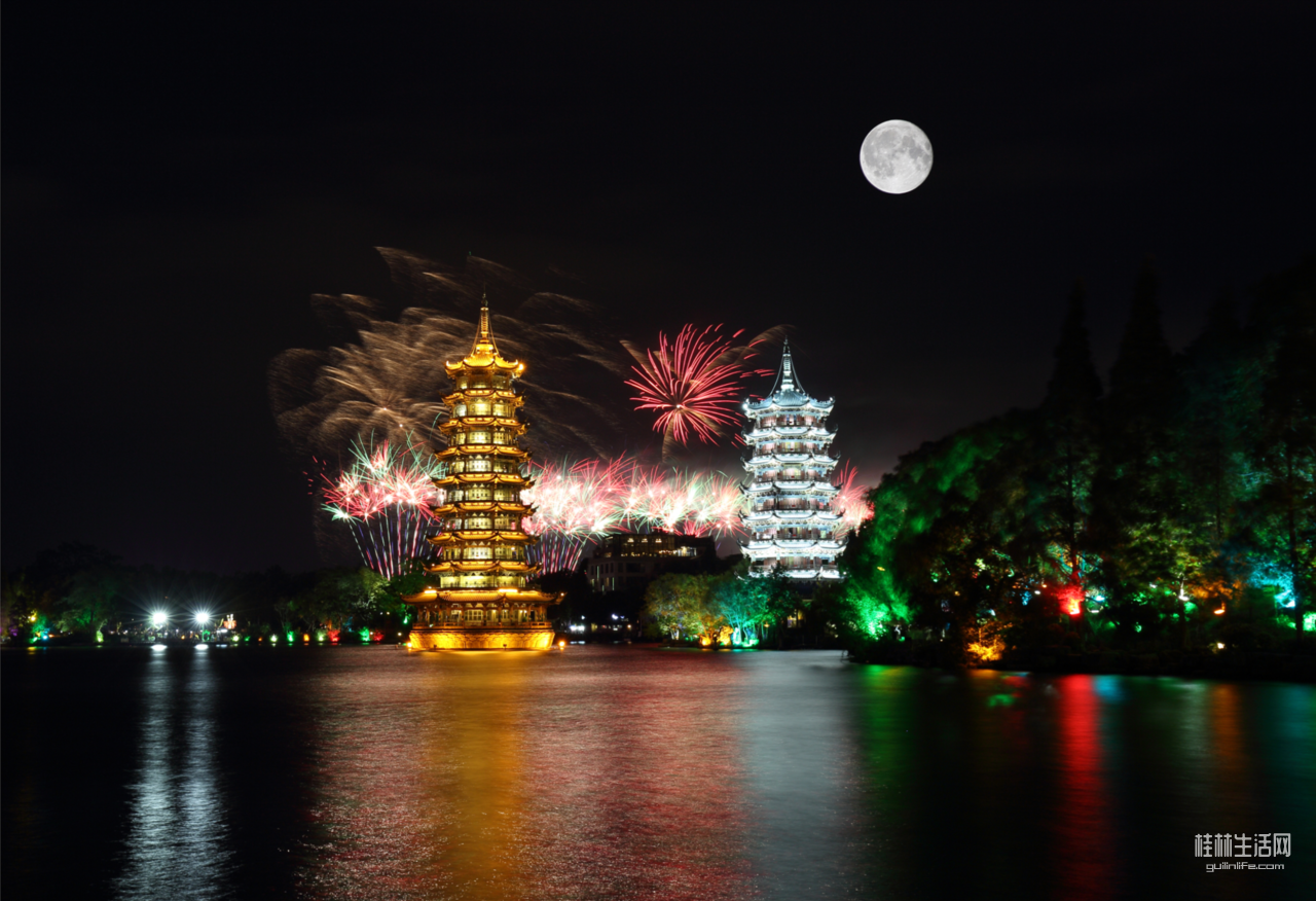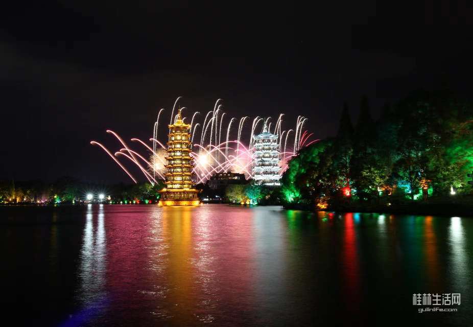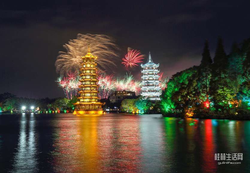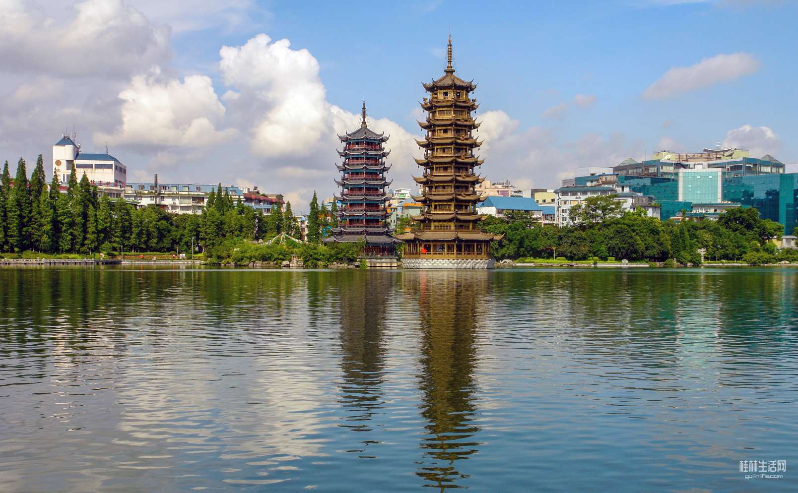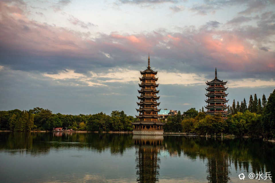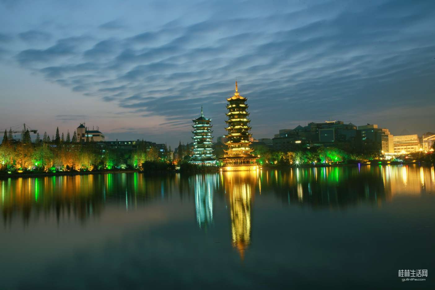 桂林日月双塔,其中日塔高41米共九层,通体均为纯铜装饰,耗用铜材350吨,金碧辉煌,并有电梯供游客观光乘坐。铜塔所有构件如塔什、瓦面、翘角、斗拱、雀替、门窗、柱梁、天面、地面完全由铜壁画装饰,整座铜塔创下了三项世界之最——世界上最高的铜塔,世界上最高的铜质建筑物,世界上最高的水中塔。 月塔高35米共七层,为琉璃塔。每层的雕花彩绘门窗寓意不同的主题,富含中国传统韵味,通过水下湖底一条10米长的湖底隧道与日塔连接,其地宫之中有桂林明代青花梅瓶大型壁画。杉湖日月双塔已成为观赏桂林城市精华美景的胜地。