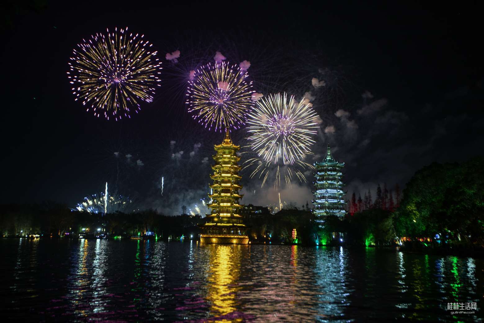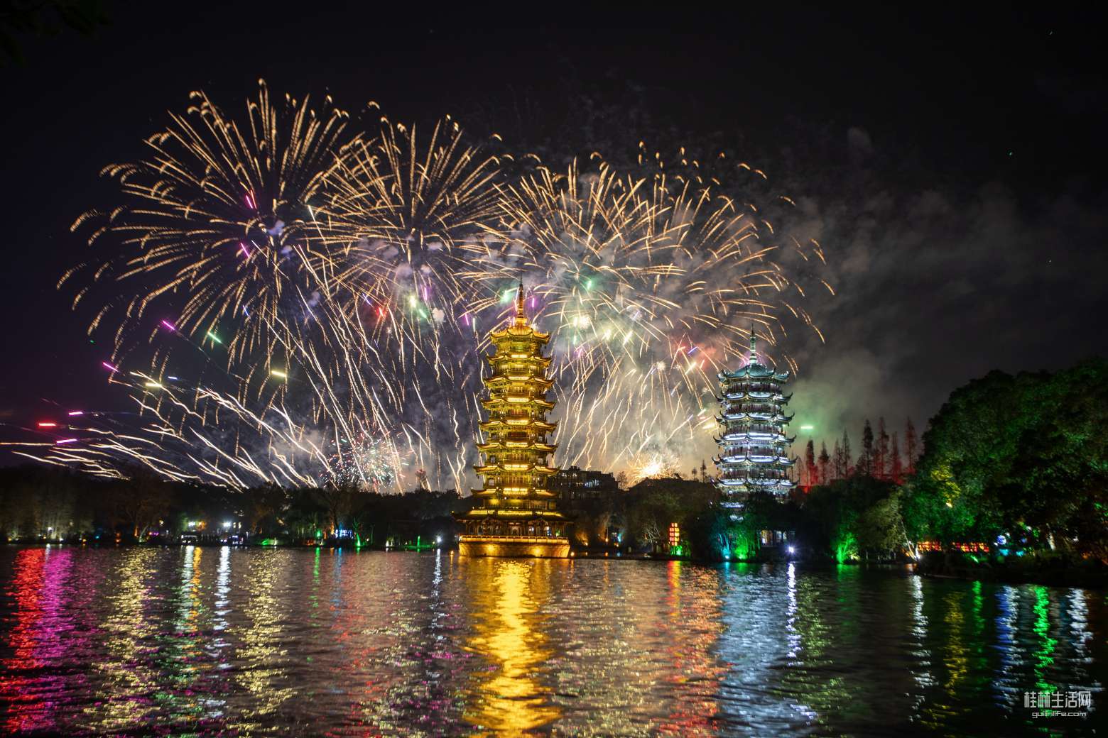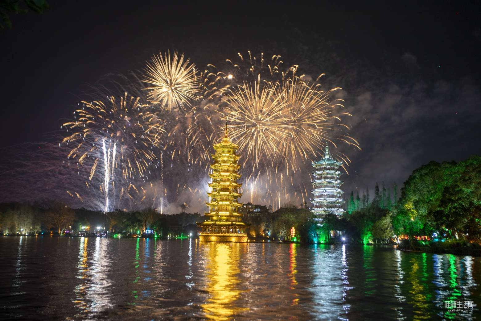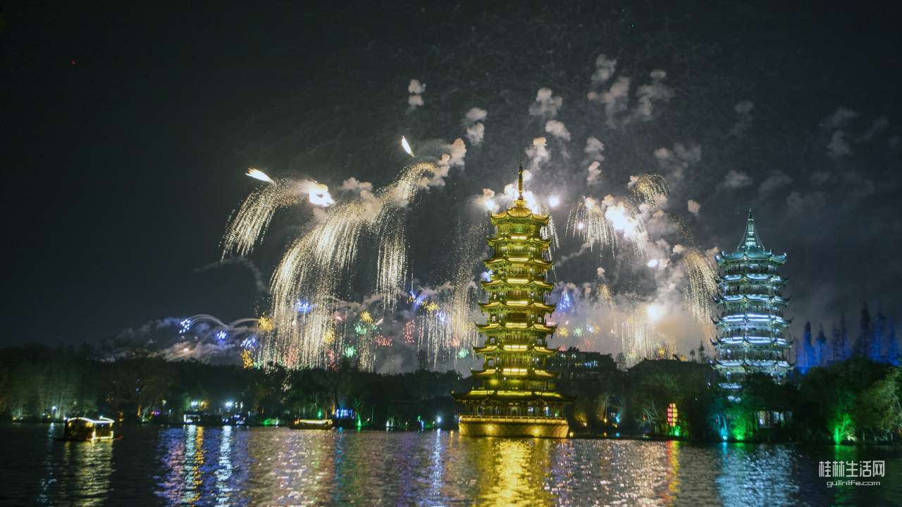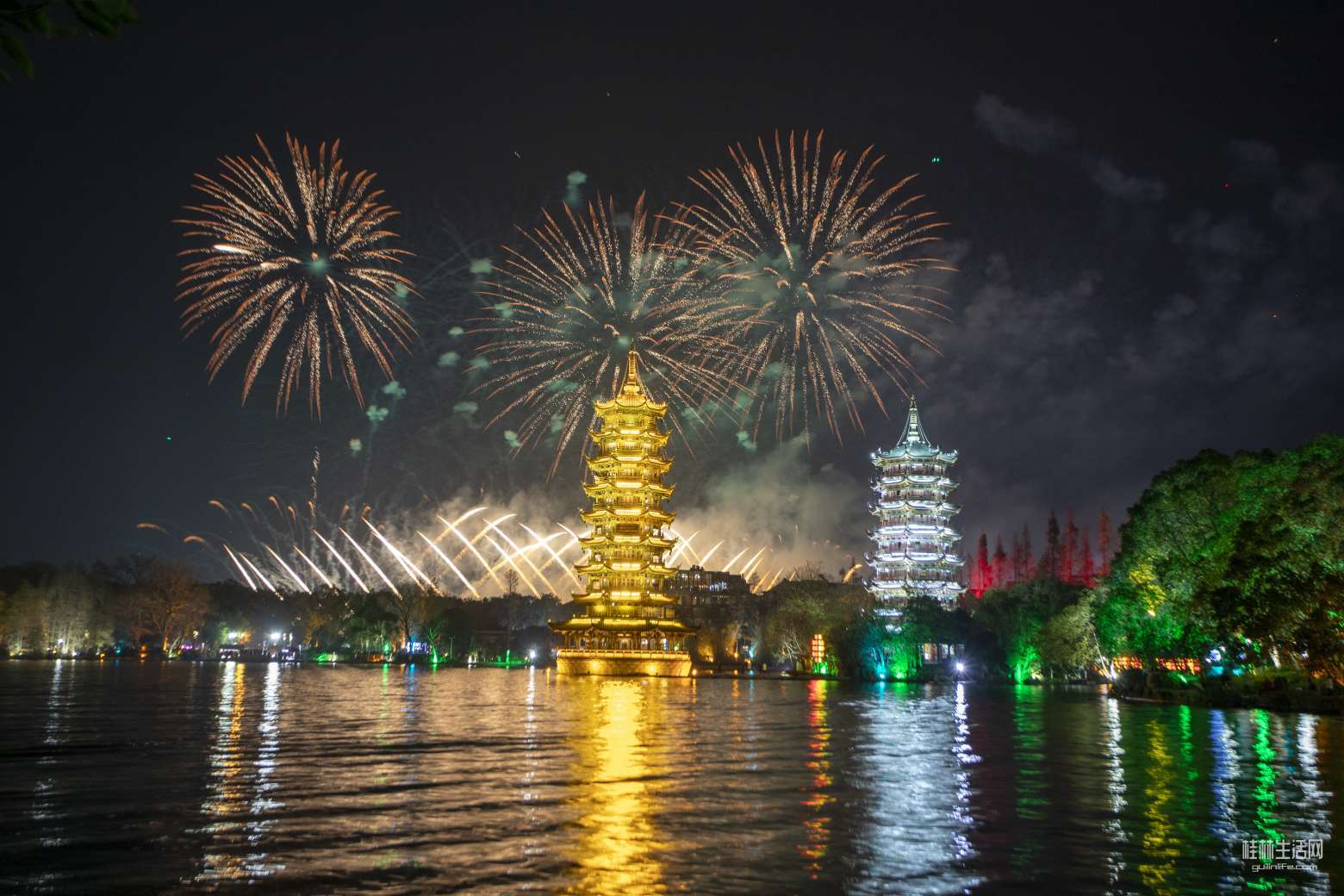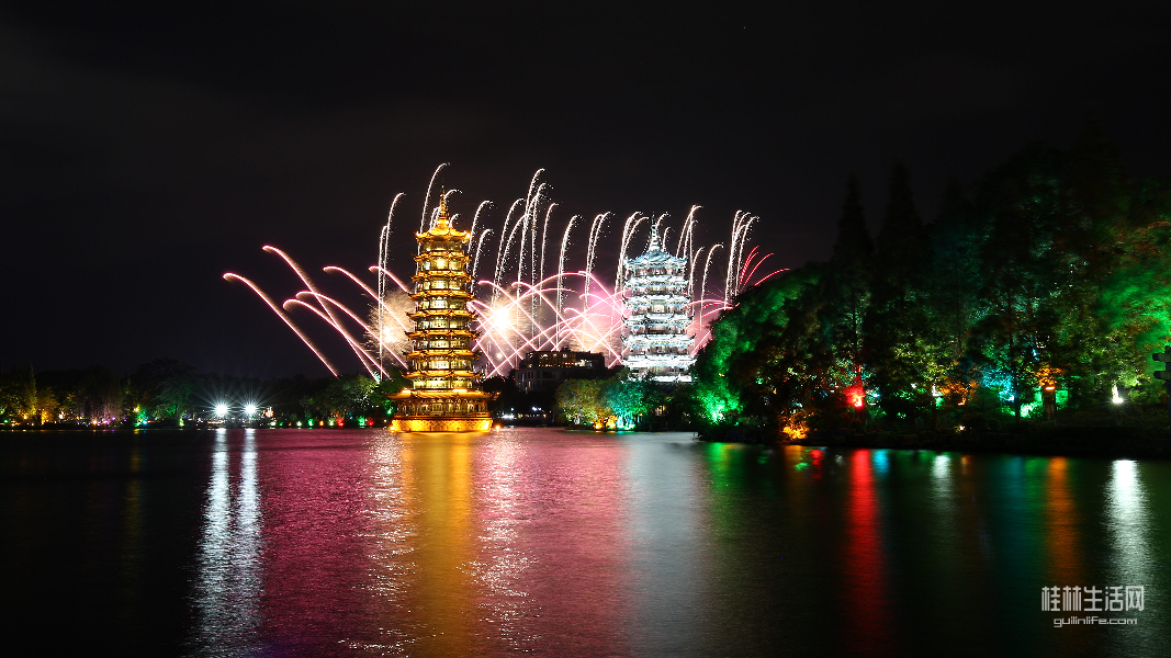 桂林日月双塔,其中日塔高41米共九层,通体均为纯铜装饰,耗用铜材350吨,金碧辉煌,并有电梯供游客观光乘坐。铜塔所有构件如塔什、瓦面、翘角、斗拱、雀替、门窗、柱梁、天面、地面完全由铜壁画装饰,整座铜塔创下了三项世界之最——世界上最高的铜塔,世界上最高的铜质建筑物,世界上最高的水中塔。 月塔高35米共七层,为琉璃塔。每层的雕花彩绘门窗寓意不同的主题,富含中国传统韵味,通过水下湖底一条10米长的湖底隧道与日塔连接,其地宫之中有桂林明代青花梅瓶大型壁画。杉湖日月双塔已成为观赏桂林城市精华美景的胜地。