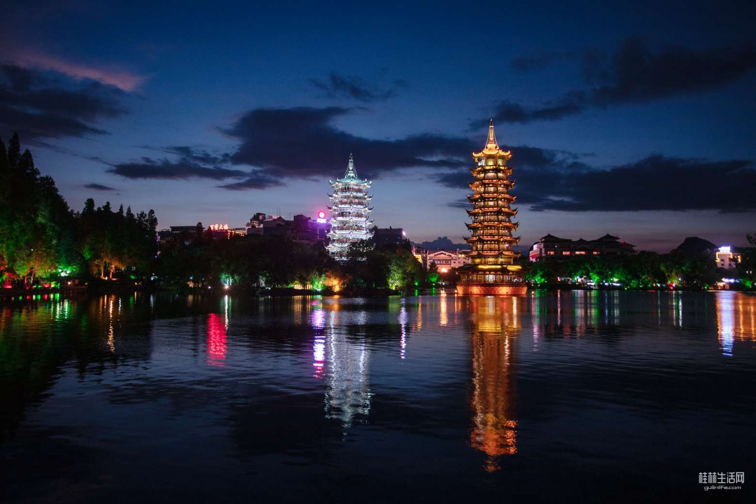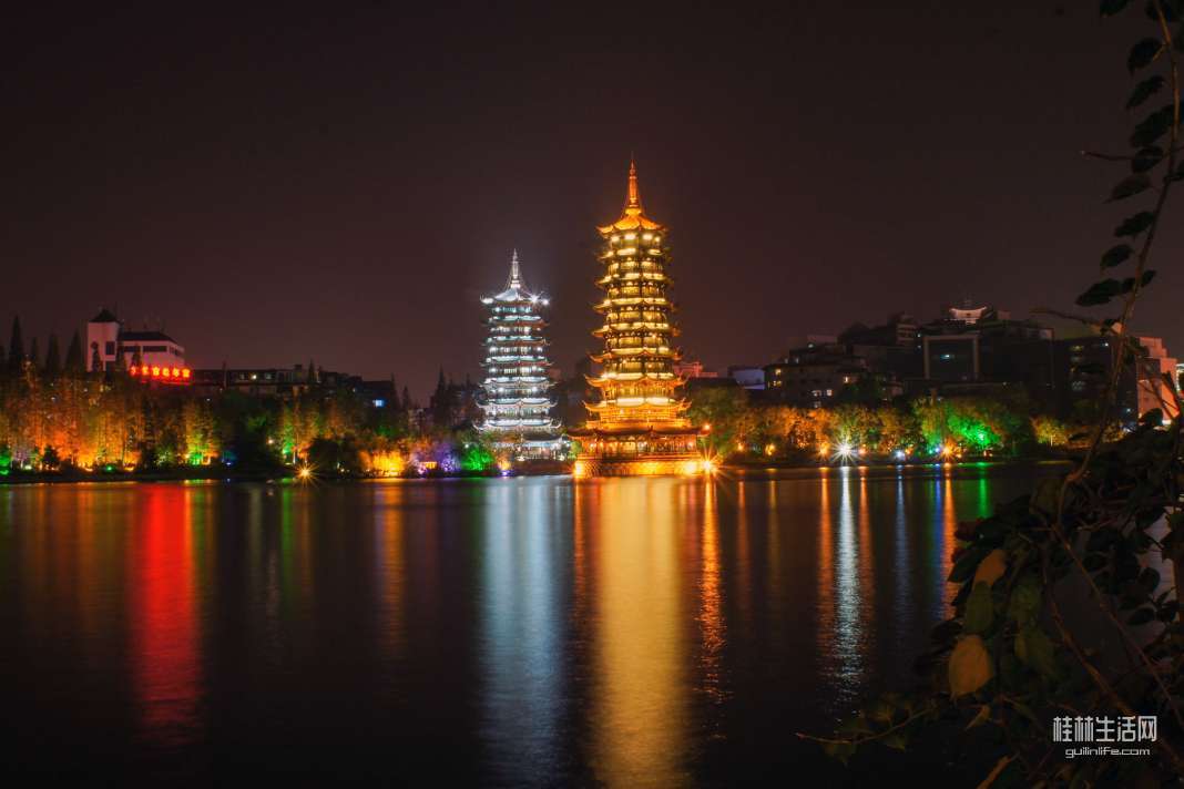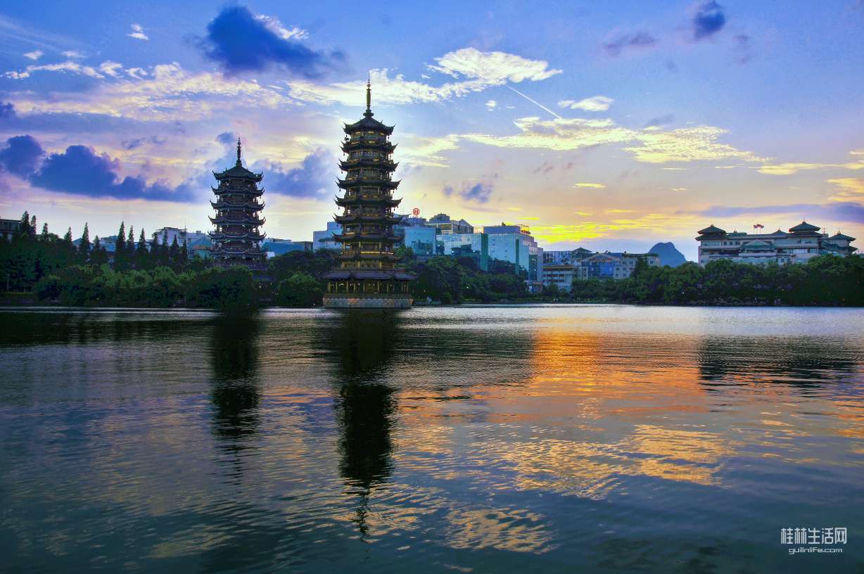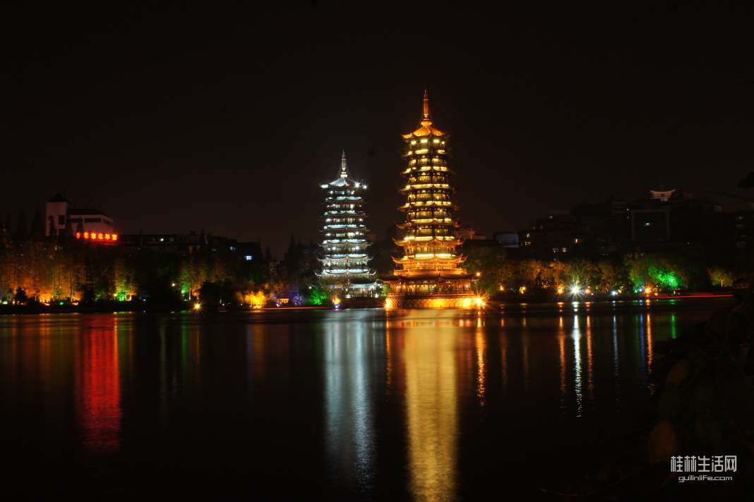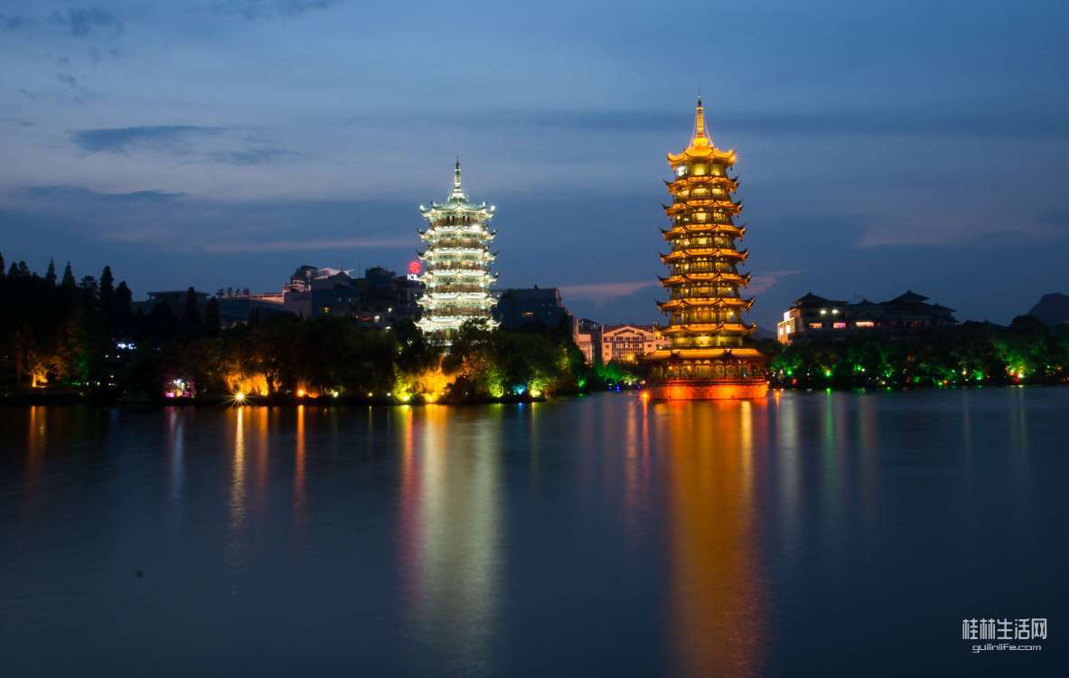 日月双塔是两江四湖环城水系中最著名的旅游景点,因为与桂海碑林中的宋代雕刻日月神菩萨隔河相对,又因为双塔高耸入云,直指日月,故名日塔、月塔。两座塔均为楼阁式山水塔。