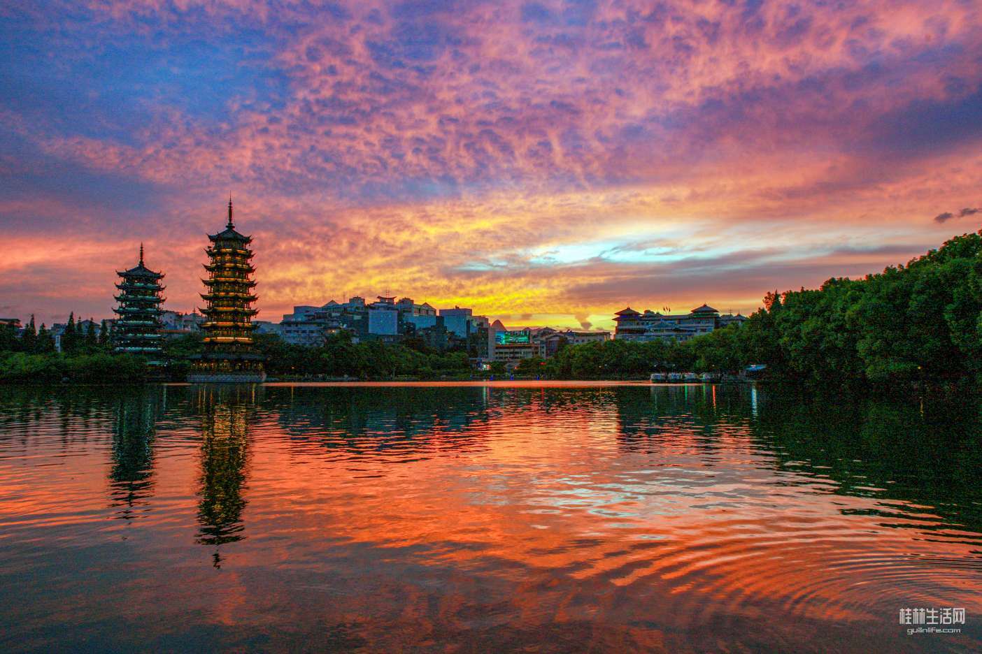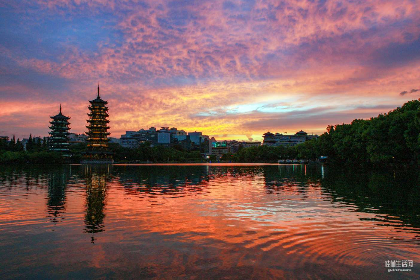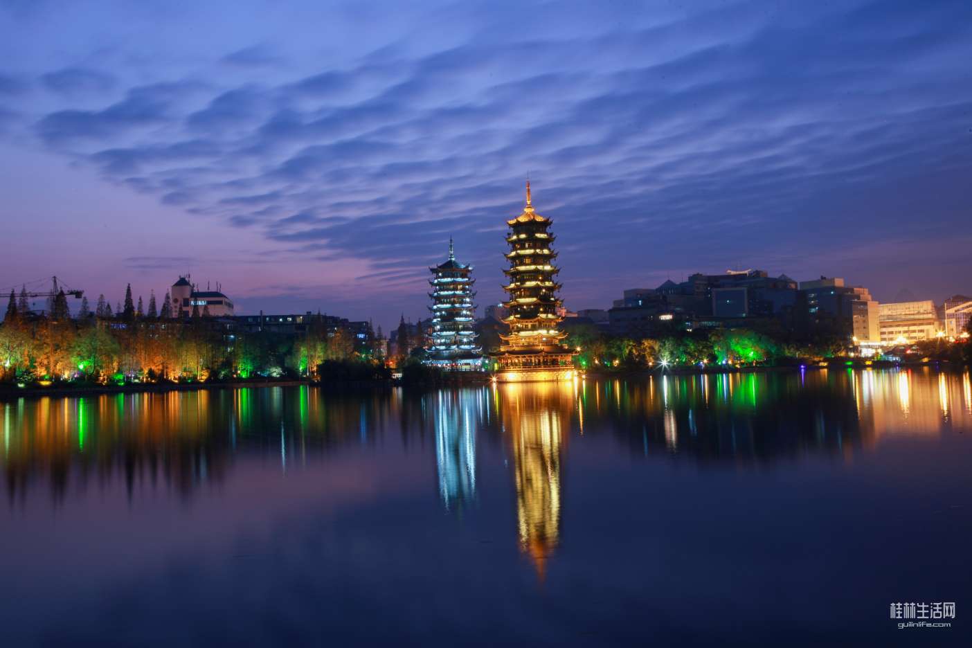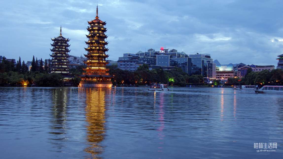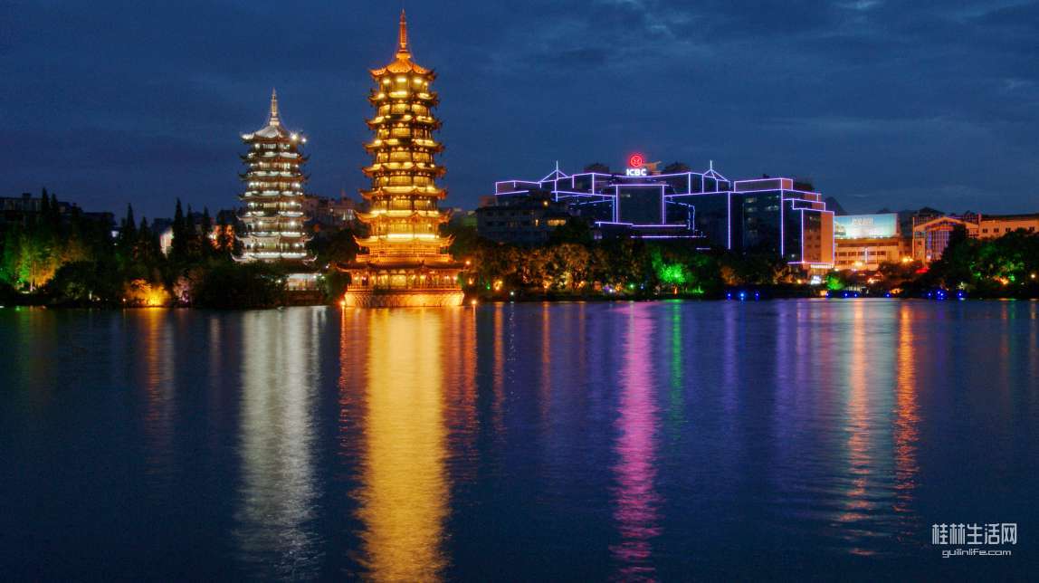 日月双塔是两江四湖环城水系中最著名的旅游景点,因为与桂海碑林中的宋代雕刻日月神菩萨隔河相对,又因为双塔高耸入云,直指日月,故名日塔、月塔。两座塔均为楼阁式山水塔。