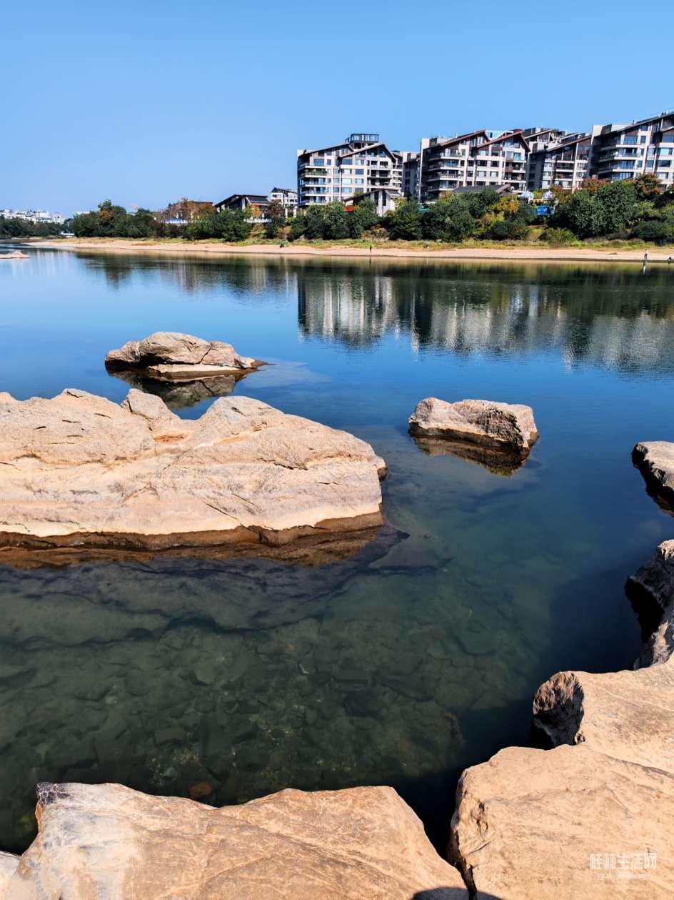 秋日太阳照在漓江上,现在是二零二五年十一月,晴空万里,秋高气爽,漓江清澈见底,青如罗带,徐霞客在三百八十多年前看到的漓江也是这样子的吗?