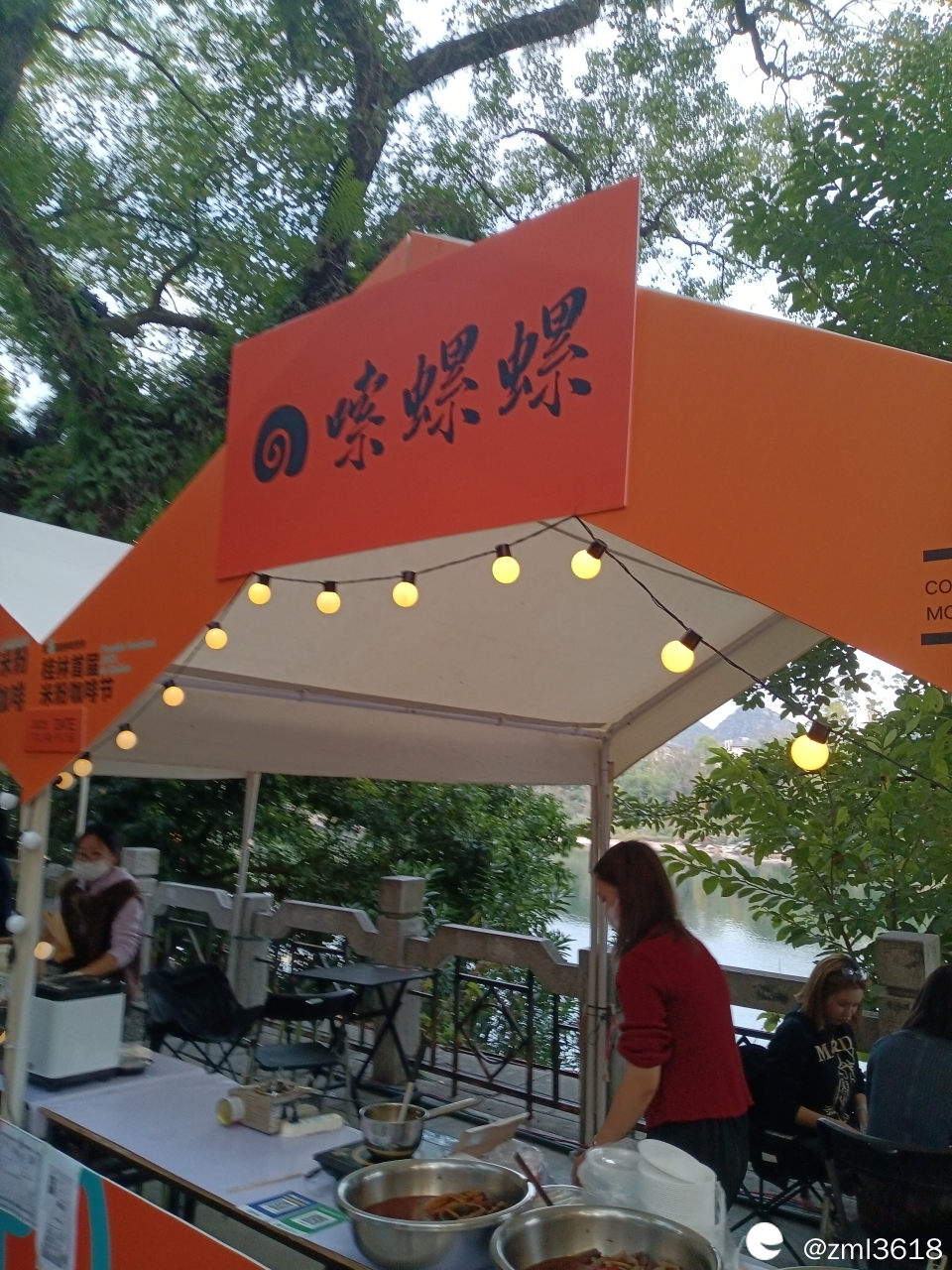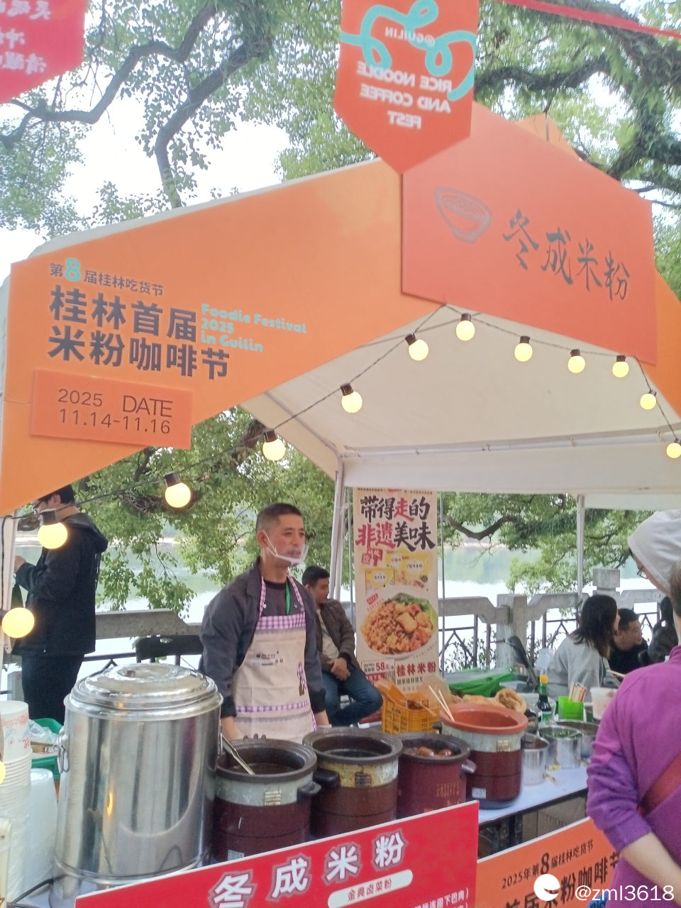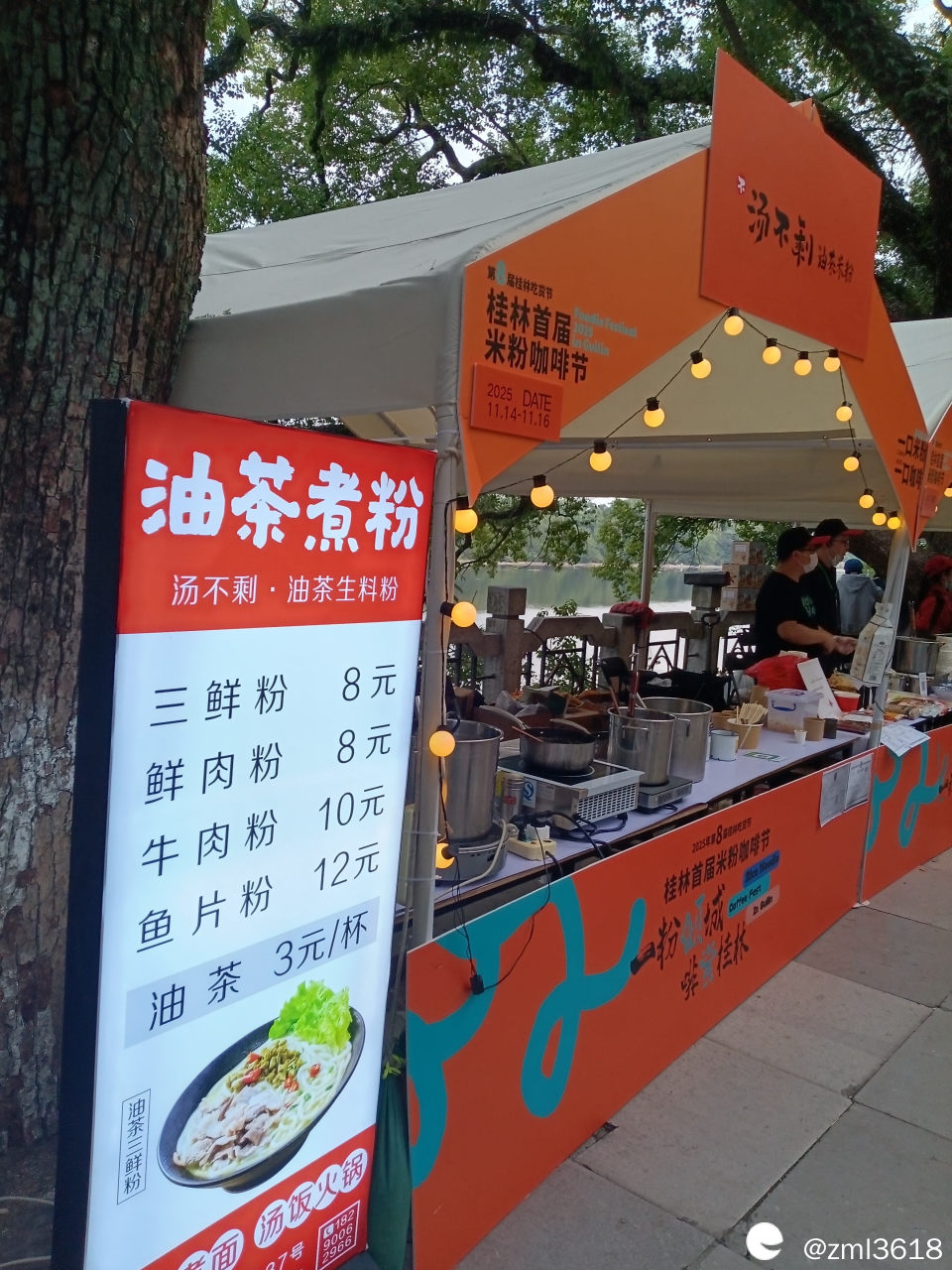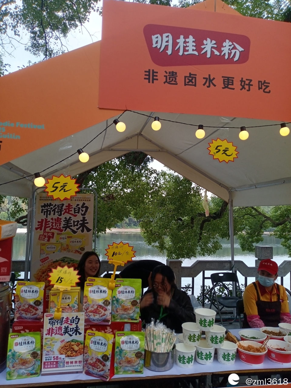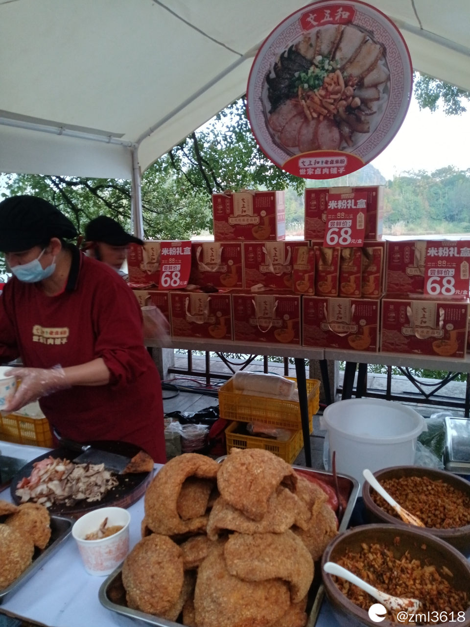 来参加咖啡米粉节的各桂林米粉店家很多,各有自家的特色,和味道,简直是各有秋千,平分秋色,且都有现场品尝,基本都是5元/2两。很受游客欢迎,很多游客买来坐在边上石凳上吃。人实在太多了,咱未能把这些店家一,一拍照 。