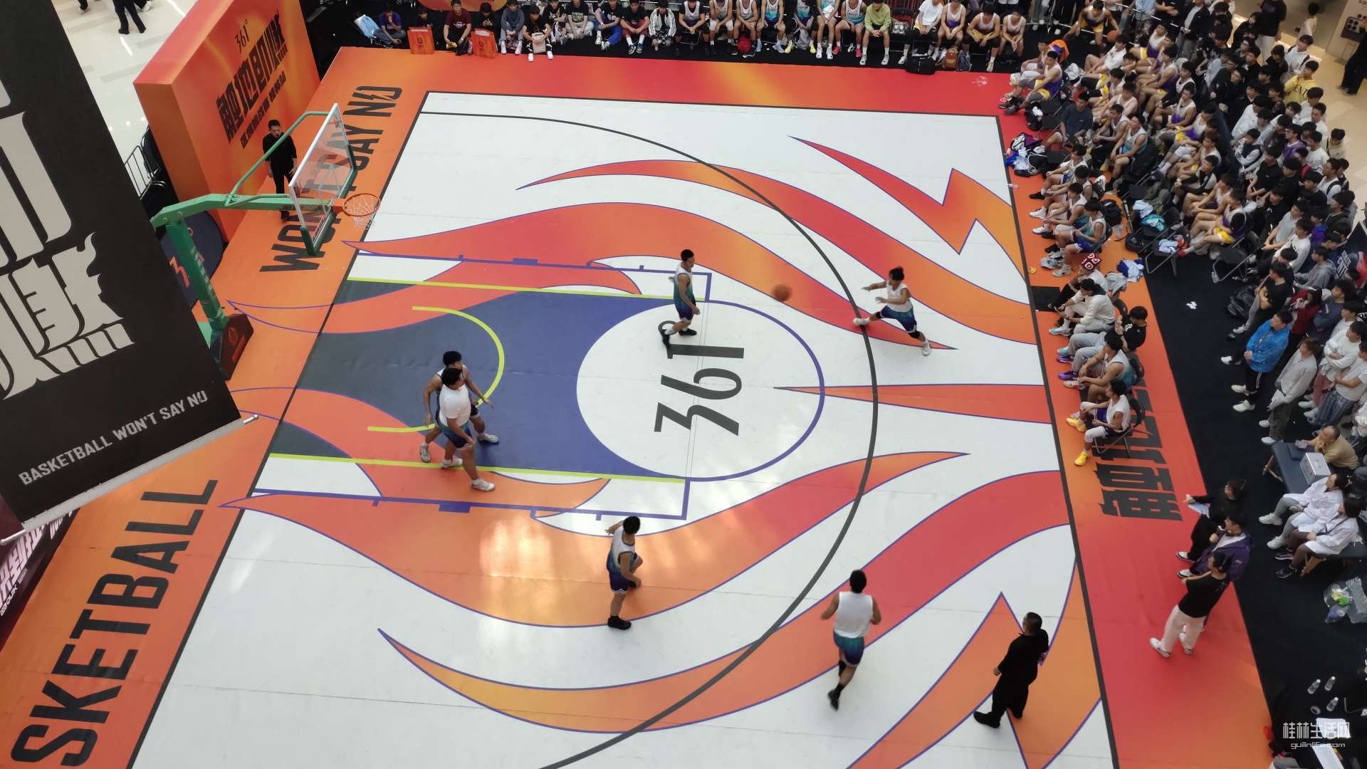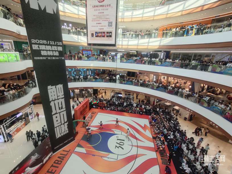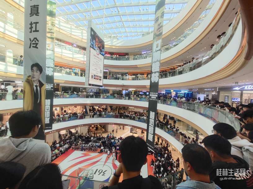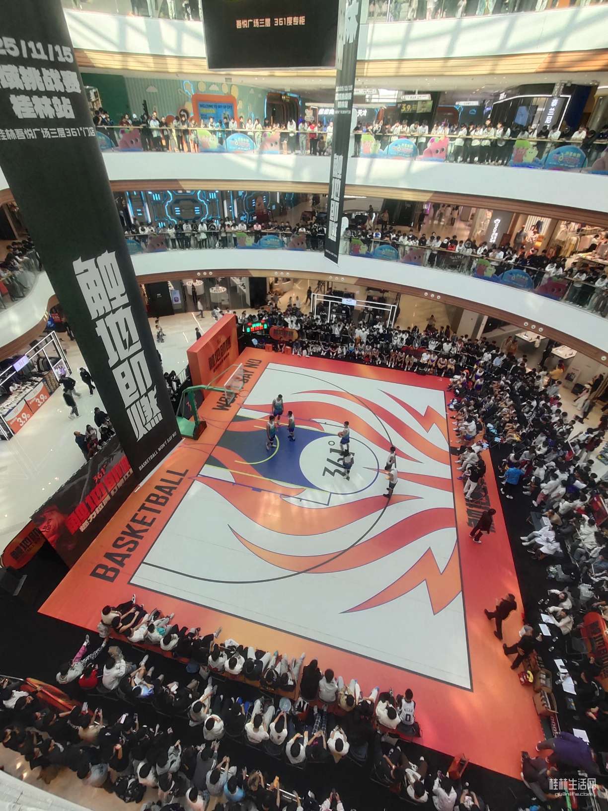 桂林临桂吾悦广场商场内,街头篮球,三对三斗牛,让整个商场小广场变成了热闹海洋,五层玻璃走廊,也变成了观众们,立体式观球的最佳角度。