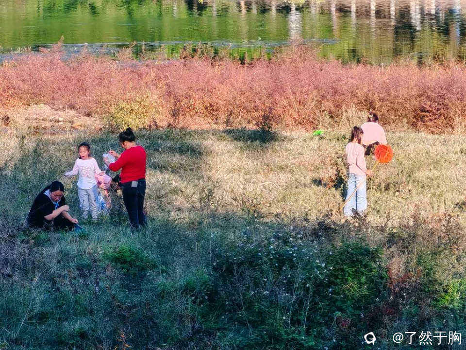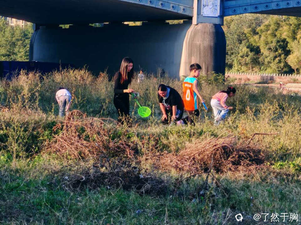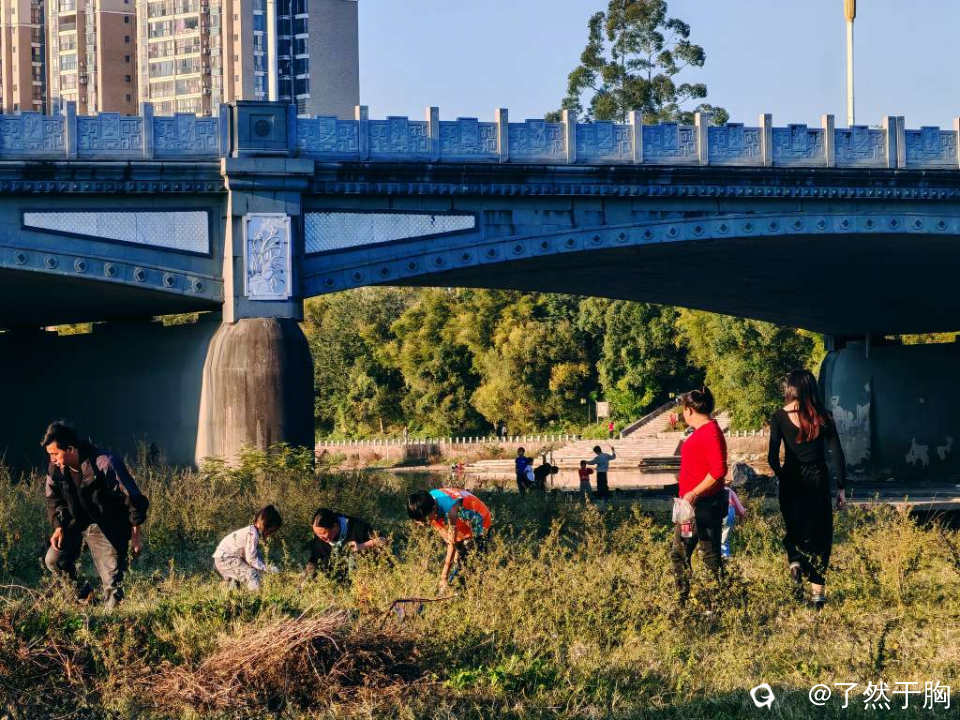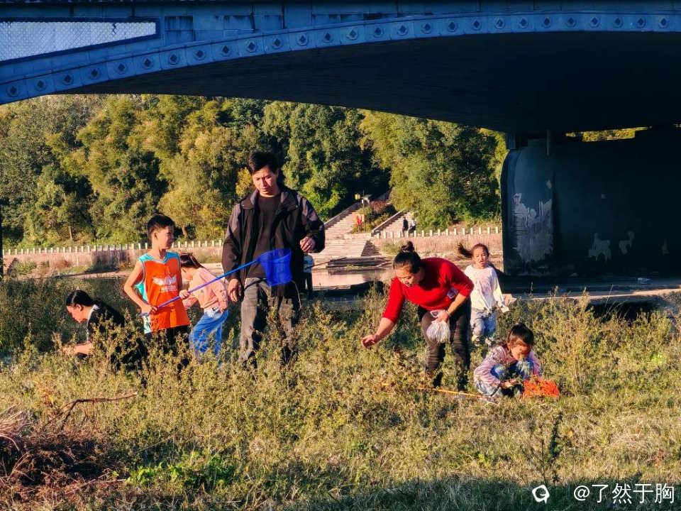 河滩草地上,不知为何,蚂蚱持别多,每天都会有人前来捕捉,只不过周末人特别多罢了。