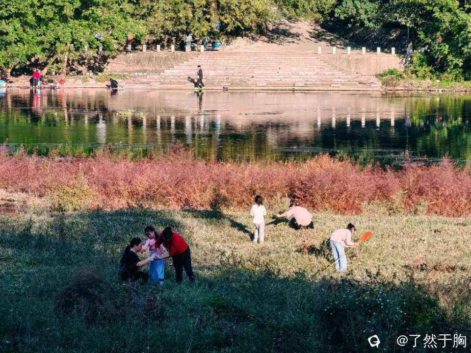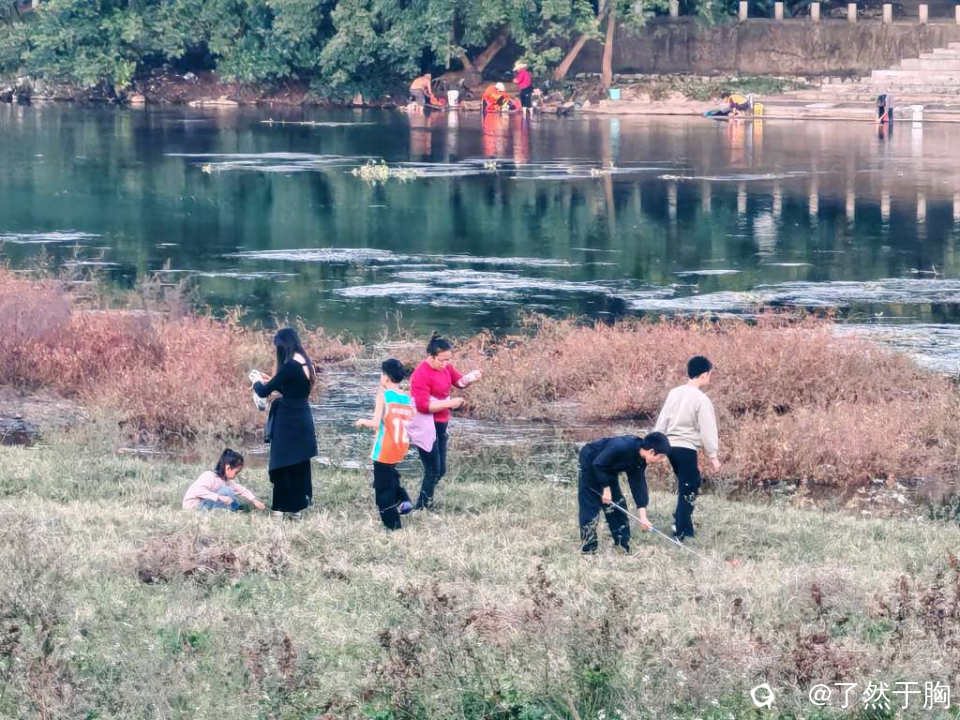 周末,天气晴暖,傍晚时分,灵川县甘棠公园的一段河滩上,聚集了许许多多捕捉蚂蚱的人。