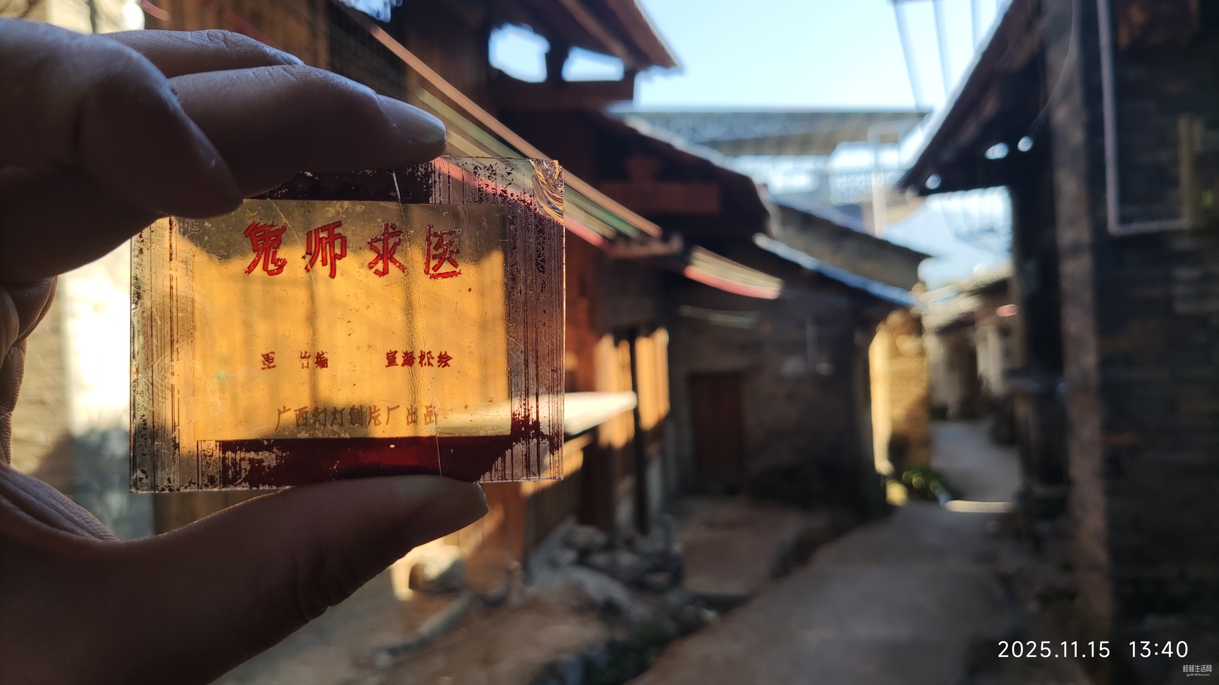 这几天,有人清理老屋,翻新墙面时,发现了一块四方小玻璃片,玻璃上写着四个红字:鬼师求医;中间的黑字:里竹编,宣海松绘;下面落款是:广西幻灯制片厂出品。