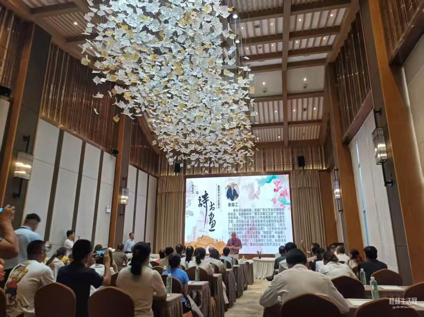 我了解到在座的有度假区员工、附近农人书画爱好者。他们正经端坐洗耳恭听。我大声呼唤他们,莫那么严肃,围拢过来看!
