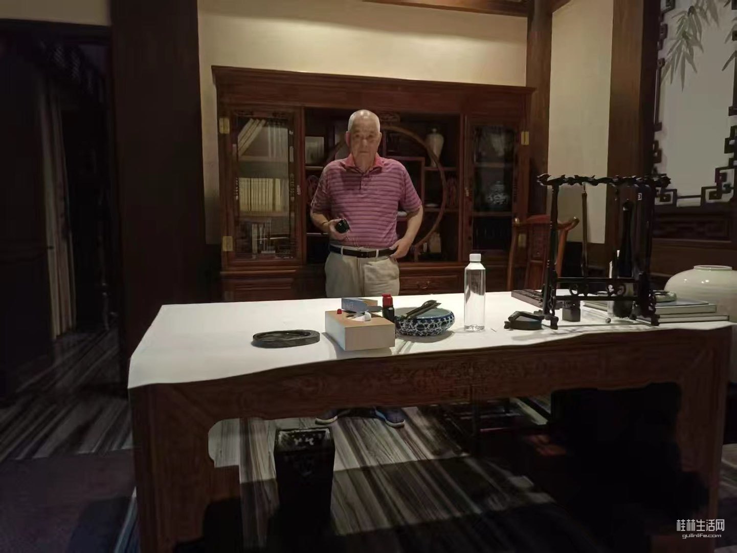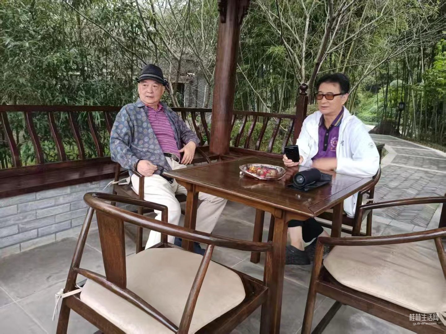 和画家陈宽闲坐小亭,吹晨风沐清新,眺看湖南零陵。