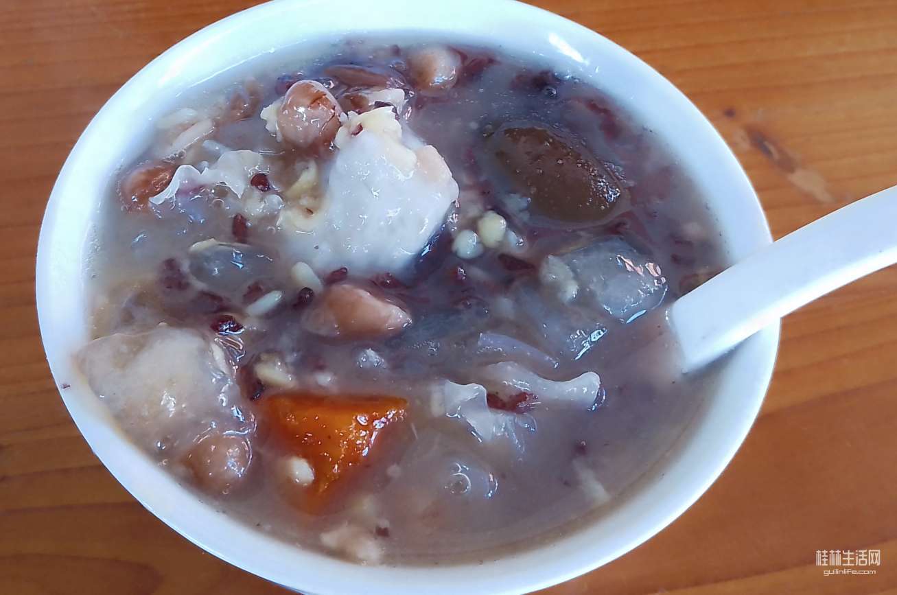 8元钱一碗的甜汤,里面有红薯、芋头、绿豆、花生、鸡蛋、薏米、黑米、银耳、清心丸,对于喜欢吃甜的人来说还是挺好喝的…