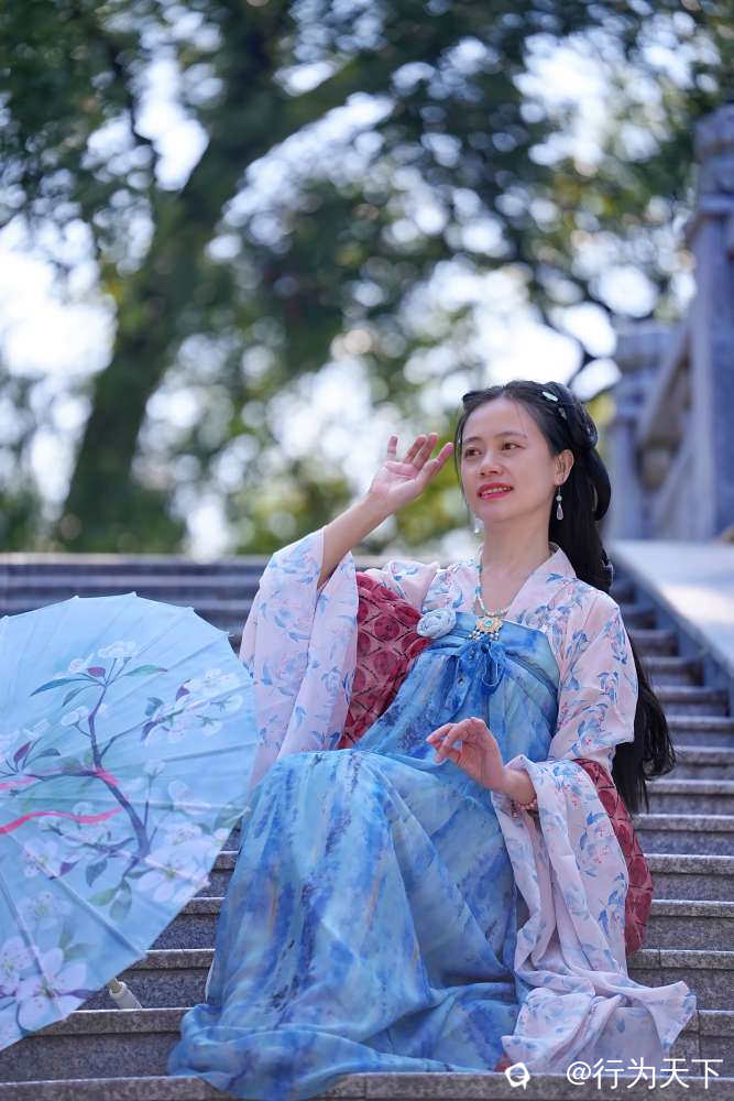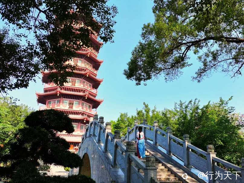 正是这古韵悠悠,让甘棠江公园成为汉服爱好者的心头好。你可见塔前石阶上,一袭明制马面裙随风轻扬,青绿间色,裙襕织金,在古塔映衬下端庄大气。