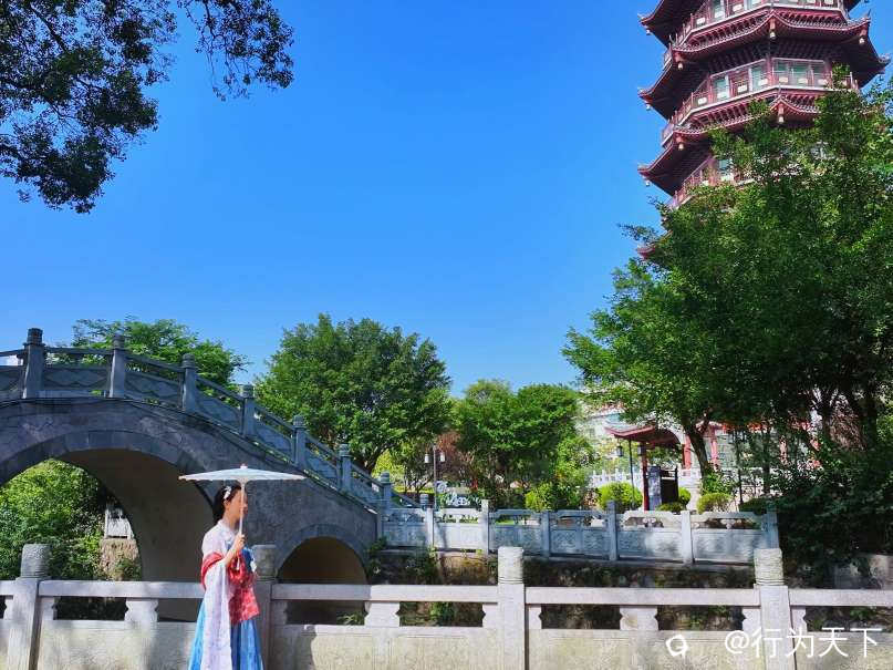 · 汉服体验:公园是天然的“古风摄影棚”。灵泽塔下的石阶、风雨桥的廊柱窗前、江边的依依垂柳,都是绝佳的汉服取景地。