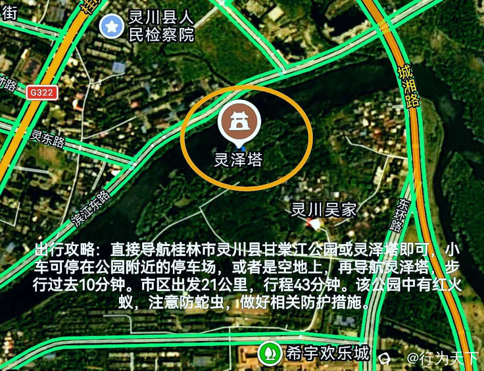 · 导航:直接搜索“灵川甘棠江公园”或“灵泽塔”,市区出发约21公里,行程43分钟。