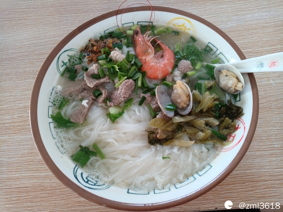 这是咱到海口吃的第一碗海南汤粉。店家用高汤单煮,配瘦肉,猪肝;几个小歪盖(贝壳)一只虾,咱自助在粉里放了点芥菜酸,蒜油,海南黄辣椒酱。汤粉的味道还行。可惜,这的鲜湿米粉实在是不尽人意,口感mei.mei的,没有桂林鲜湿米粉那般爽滑,Q弹,那就将就吧。