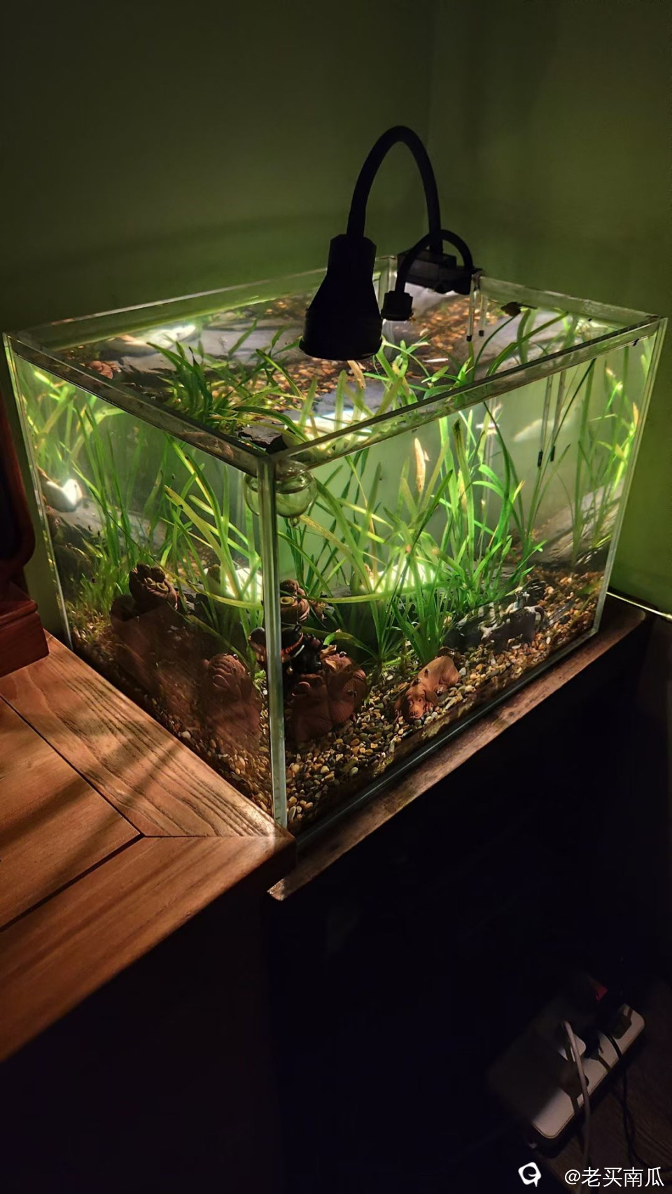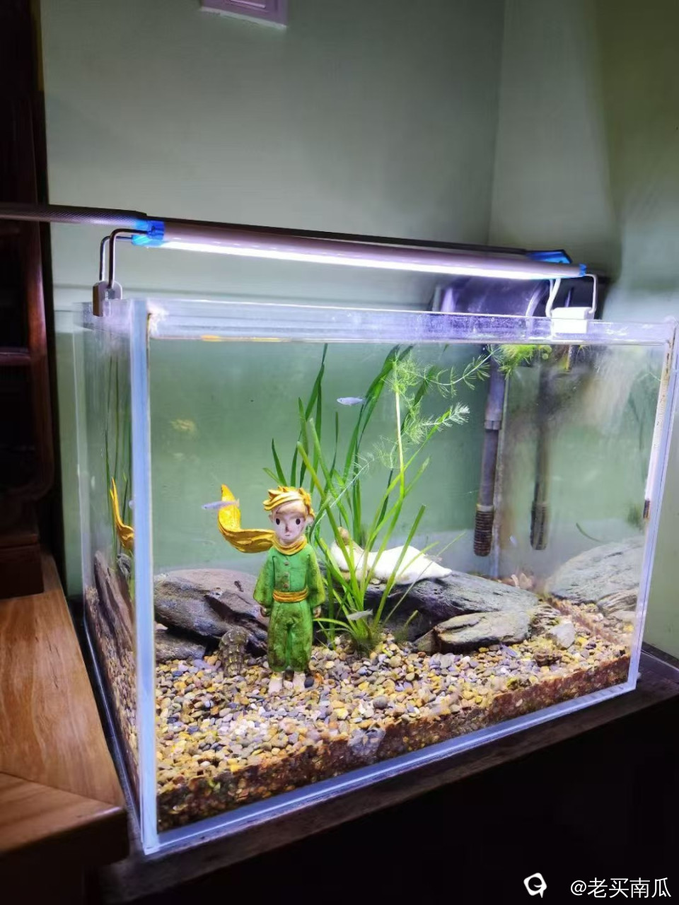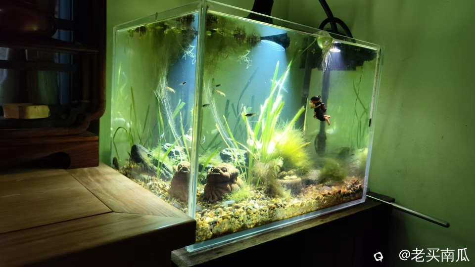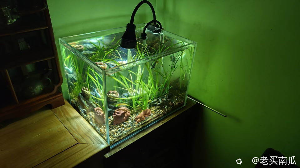 今年3月,新布景了一个小鱼缸,准备古法养法:就是不用流水系统,只换水。水草是漓江的,沙子也是漓江的,螺丝也是漓江的,一切都是来自大自然……