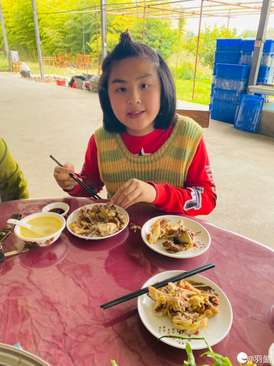 父女俩打完球直奔餐桌,捧着咕嘟冒泡的鸡汤猛喝,鲜嫩鸡肉啃得超香~