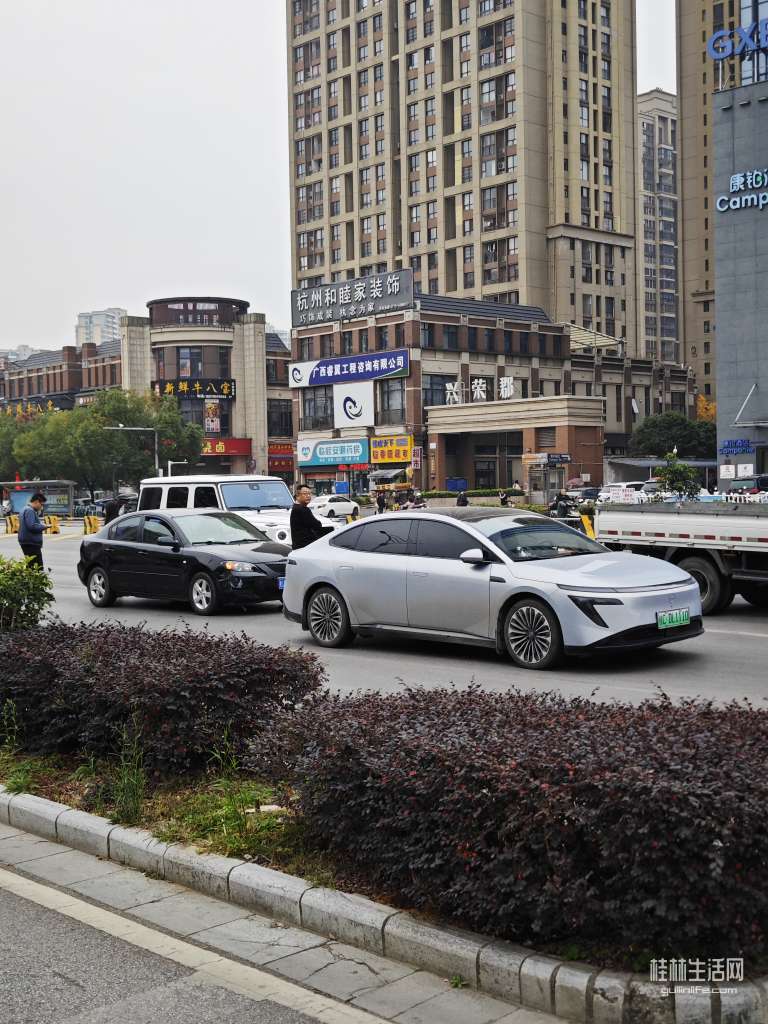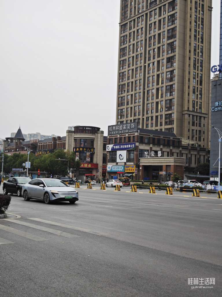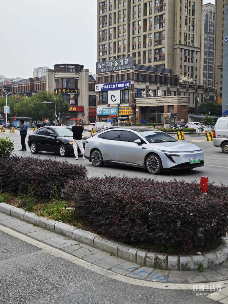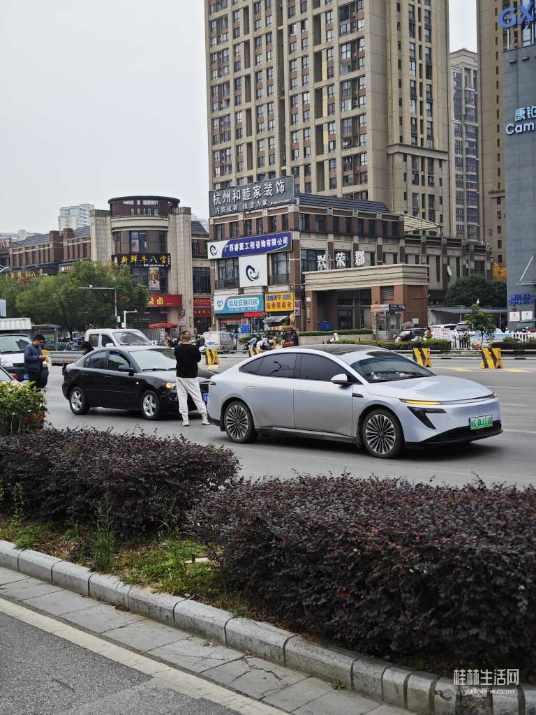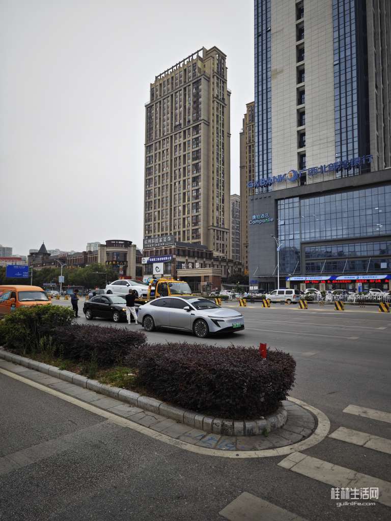 今天在临桂新区西城北路,发生了因礼让行人过斑马线而发生两车追尾事故。