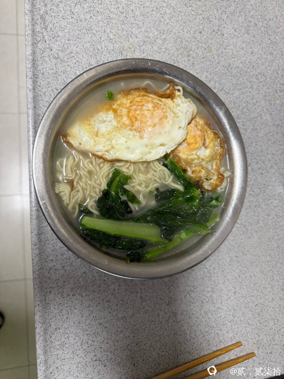 至于自己的早餐就更简单,两个鸡蛋一块面,搭几片青菜对付了事!