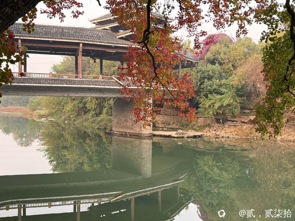 一进鲁家村口,乌桕的红叶,风雨桥,倒影,构成了一幅中国画!