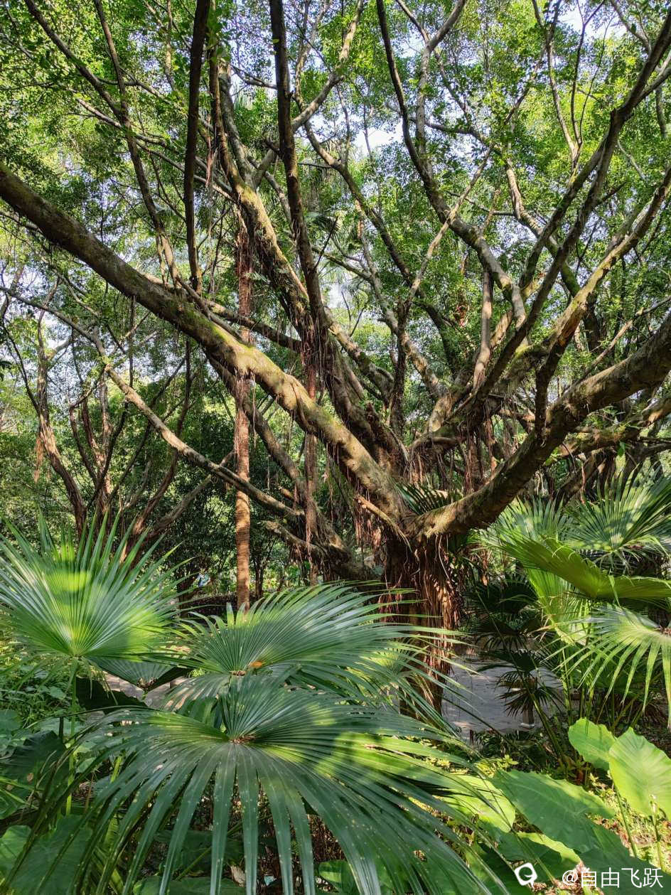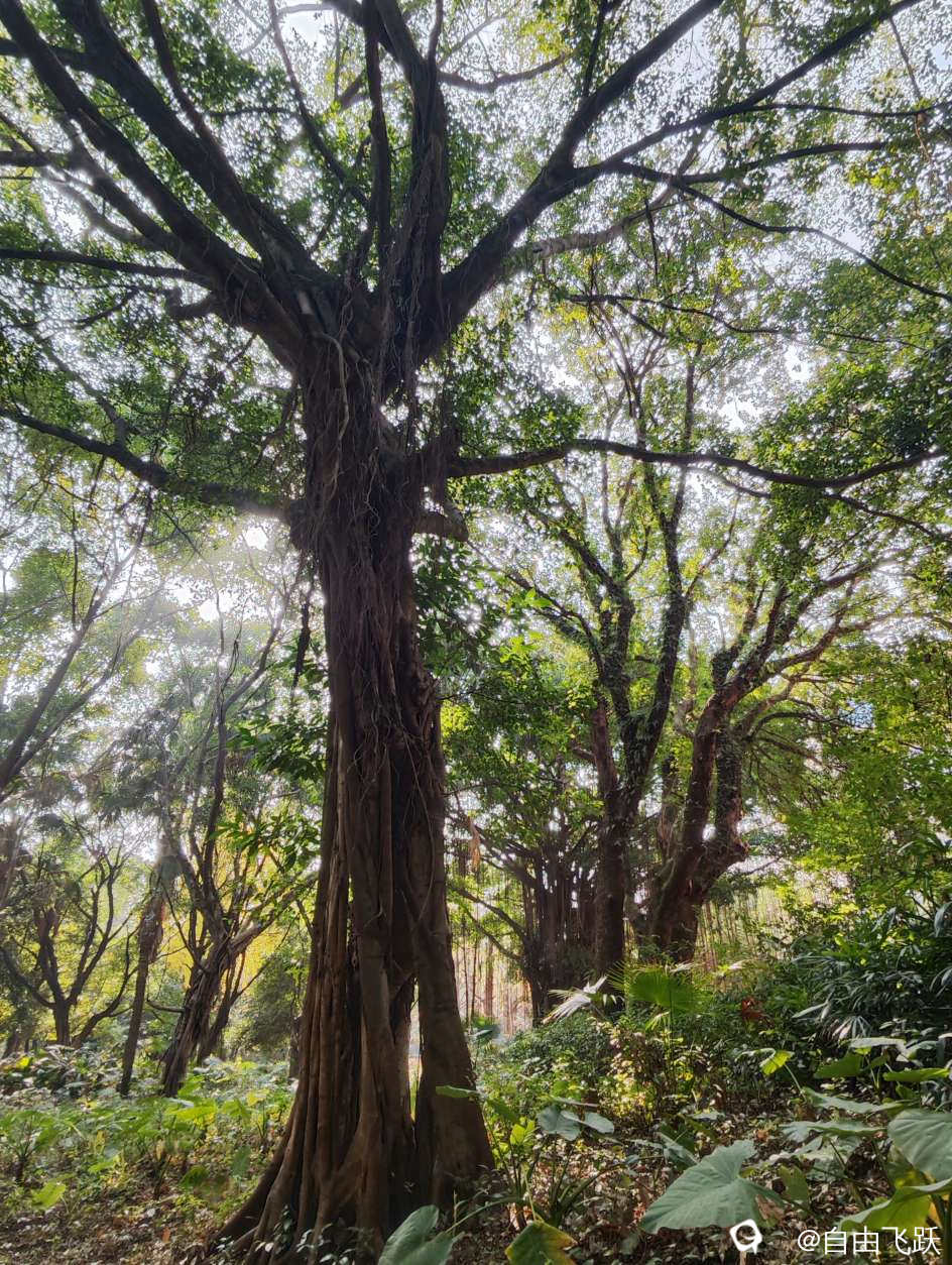 一棵榕树附着在一棵不知名树上寄生,看起来就像是树骑树: