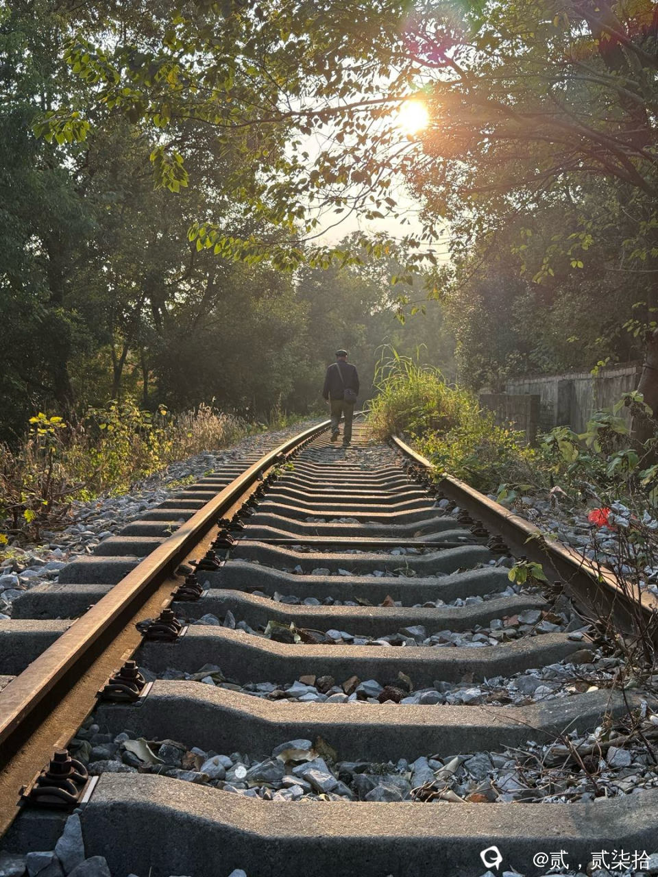 废弃的铁路,锈褐色的铁轨,迟暮的老人 ,落山的夕阳