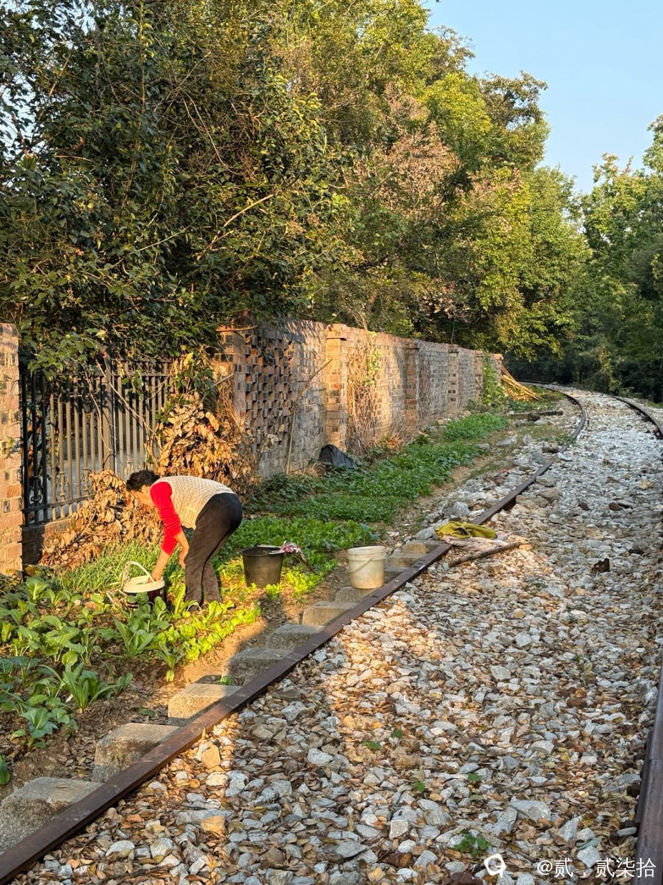 铁路边种菜的老人家,沐浴着夕阳,
