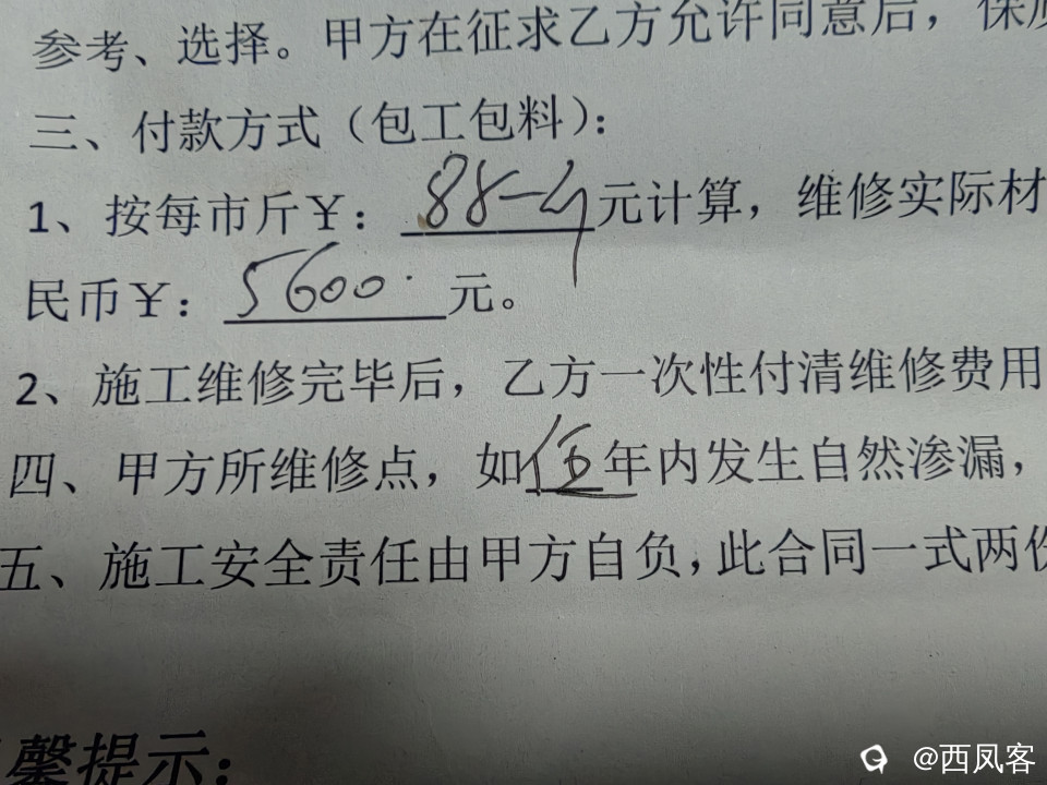 合同条款就有问题,“甲方所维修点”,这样的表述不恰当,应该注明施工方所维修的卫生间五年内出现渗漏的,属于施工质量问题,必须赔偿业主方损失,以施工方收取的金额为基数,加倍赔偿。