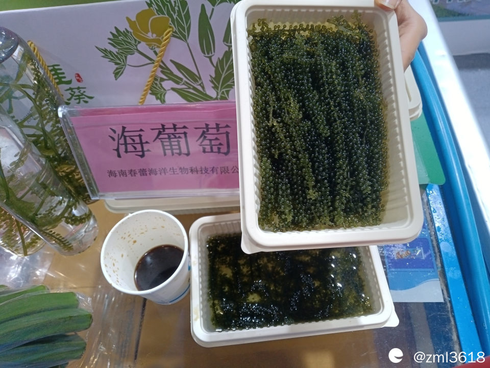我是头一回看到海葡萄,展台女孩叫我品尝一下,这海葡萄,口感有点脆淡淡的咸味,不费牙,没有海蜇皮硬,用于凉拌。