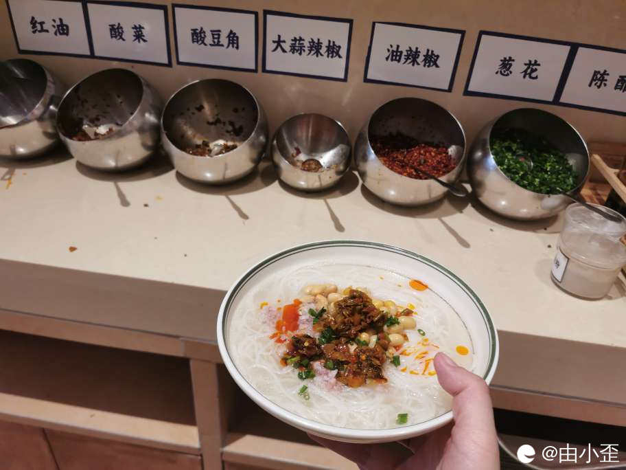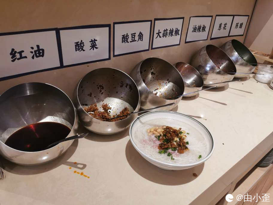 我放了一点酸菜、酸豆角和葱花,还有半勺红油。